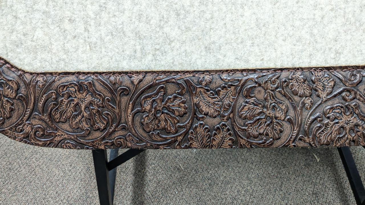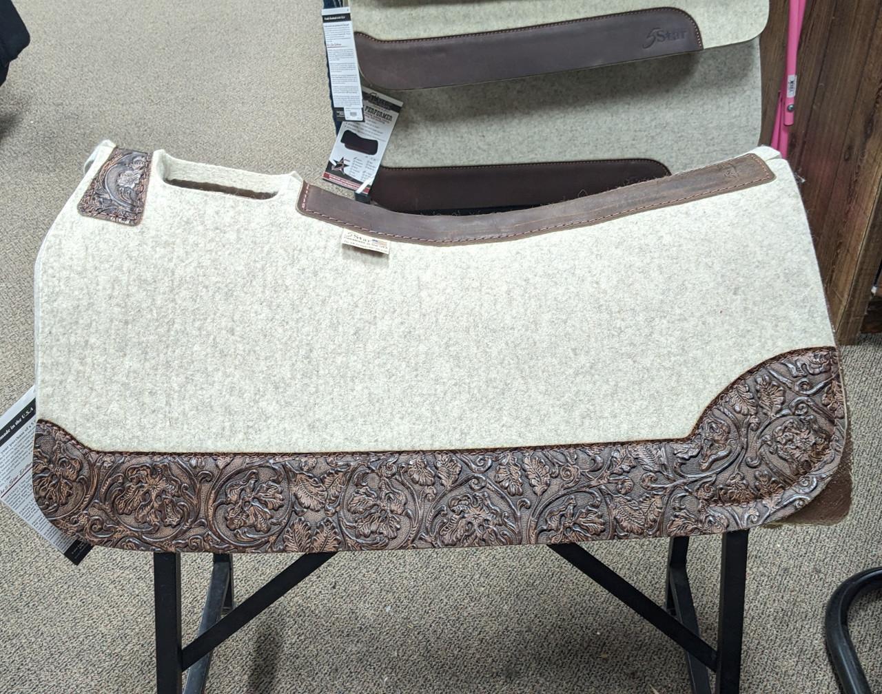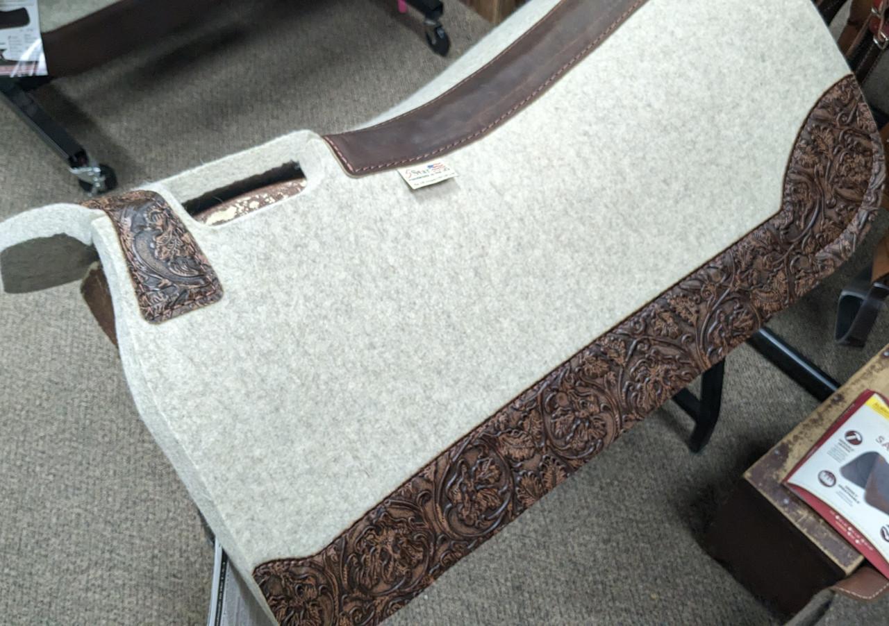 The All Around 5 Star Saddle Pad is our #1 Seller. It is a great pad for Barrel Racing, Trail Riding, and Roping as well as Smaller Skirted Saddles. The 100% pure virgin wool felt wicks away moisture, cleans up easily and stabilizes your saddle with limited cinching. Wear leathers provide protection and durability. Hand-made in the USA!