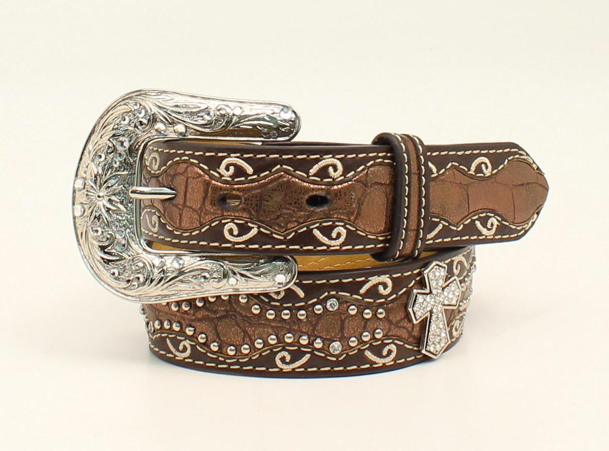 This belt is sure to be your little cowgirl's favorite! Girls' Ariat leather belt. This girls' belt is made of genuine leather and features a scalloped inlay with a fancy croc print. Silver-tone studs, a crystal embellished cross Concho, and scroll embroidery accents add extra visual interest.