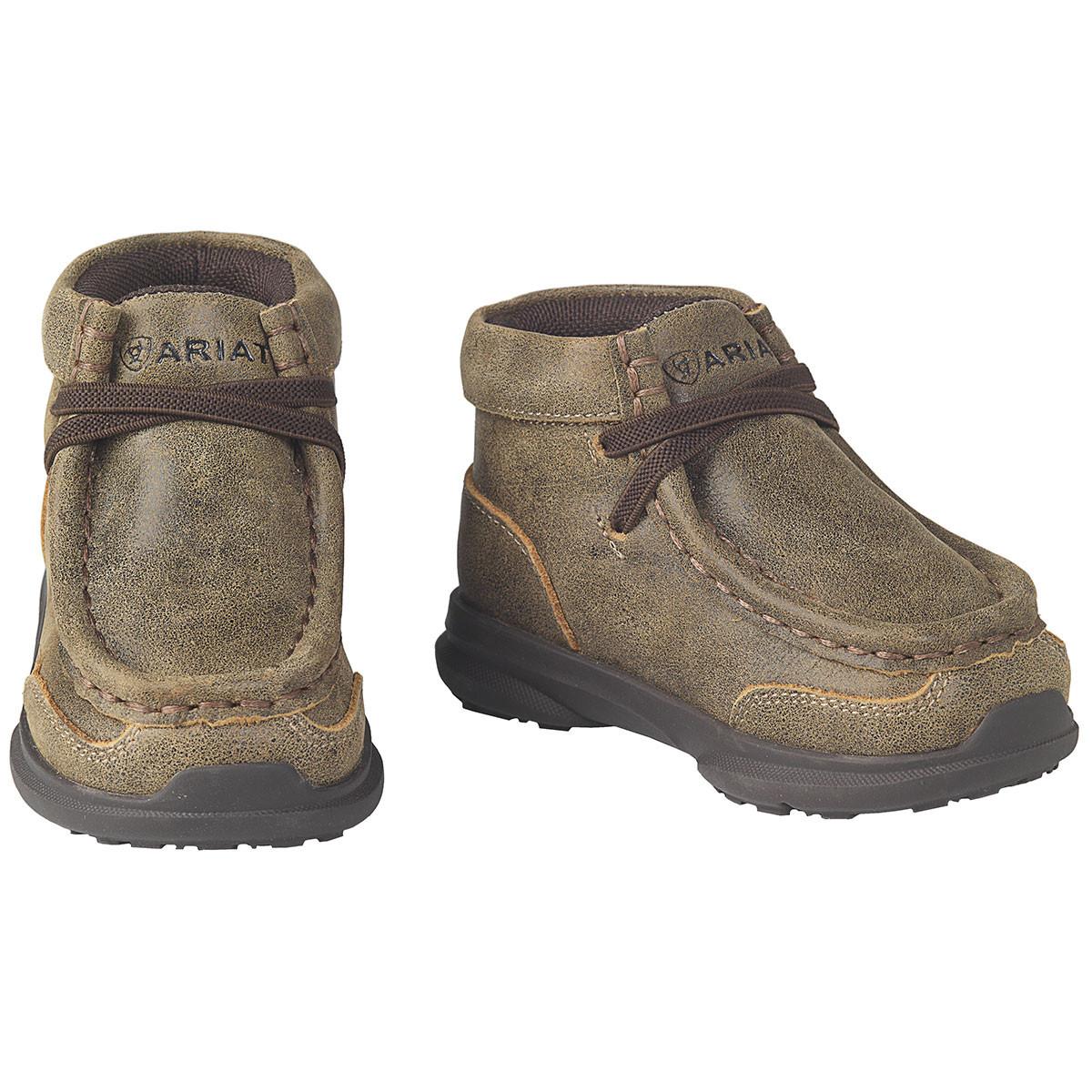 All day fun in these Ariat LIL’ STOMPERS toddler casual shoes by M&F Western Products. Natural color leather shoe with Ariat embossed on the tongue and brown elastic laces. Soft and fashionable, and easy to get on and off. Super comfortable for all day wear.