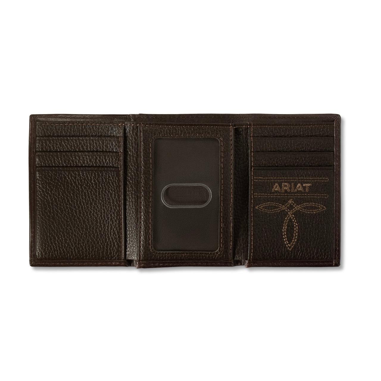 This Ariat trifold wallet by M&F Western Products is genuine leather. Chocolate leather body with a basket weave embossing and brindle calf hair overlay. Accented with a laser etched Ariat shield. Cash and multiple card slots, checkbook slot and ID window on the inside.