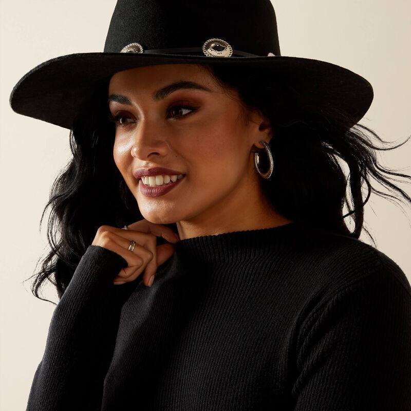 The LBD - all grown up. Crafted from soft jersey knit, this sweater dress is comfortable enough for every day yet feels really chic, thanks to a high neckline and sophisticated long sleeves. Tassels at the hem add Western flair.