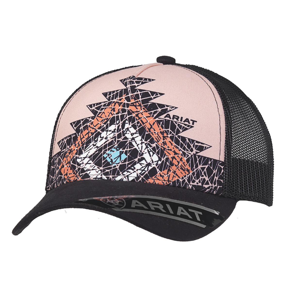 You will love this fashionable Ariat ladies cap by M&F Western Products. The front of the cap has a pink, black, white and blue crackle Aztec design. Black mesh back with Velcro closure for a great fit