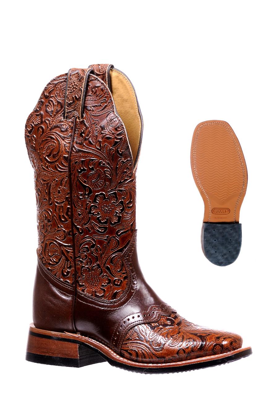 Ladies Boulet boots Style 2050. Hand Tooled leather on the foot and shaft. The shaft (12") is slightly lower than your normal boot. The cut out smooth leather overlay on the top of the shaft and a saddle vamp give it a nice contrast. They feature a wide square toe, stockman's heel, a vibram sole, double stitched welt and a saddle vamp. 1C Fitting.