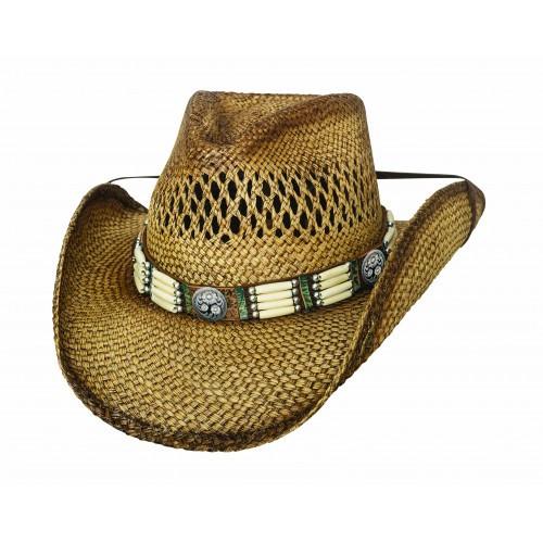 This straw hat from Bullhide has vintage western style with a wide leather hat band featuring bone and silver-tone beads and Conchos. The straw hat also has a rugged burnished finish, crown ventilation and a handy stampede string to keep it in place.