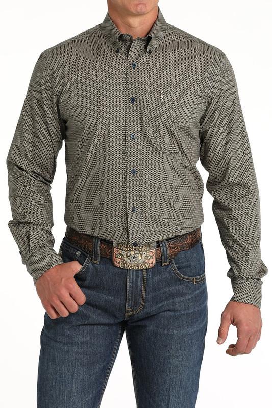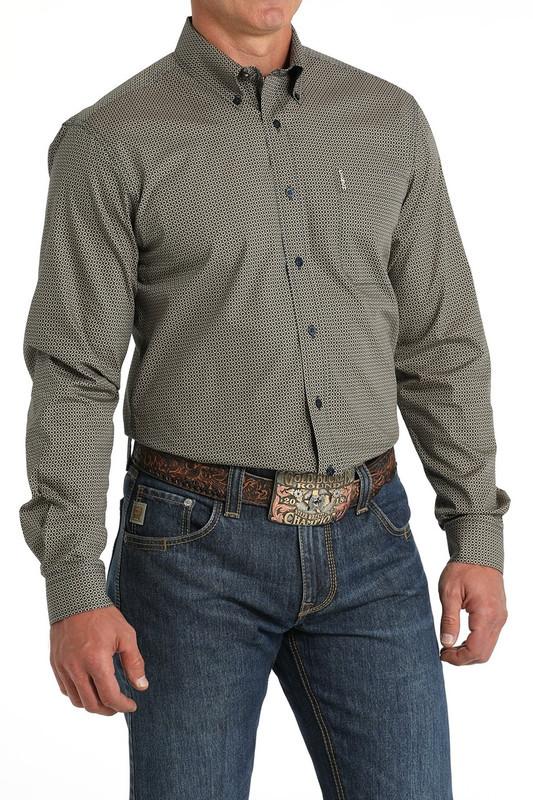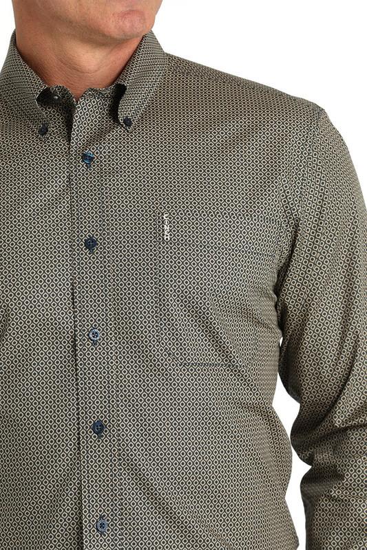 This Modern Fit brown printed cotton plain weave by CINCH will easily fit into your weekly wardrobe rotation. Design features include an open left front pocket, embroidered logo and navy buttons. Pair yours with blue jeans or khakis for your 9 to 5.