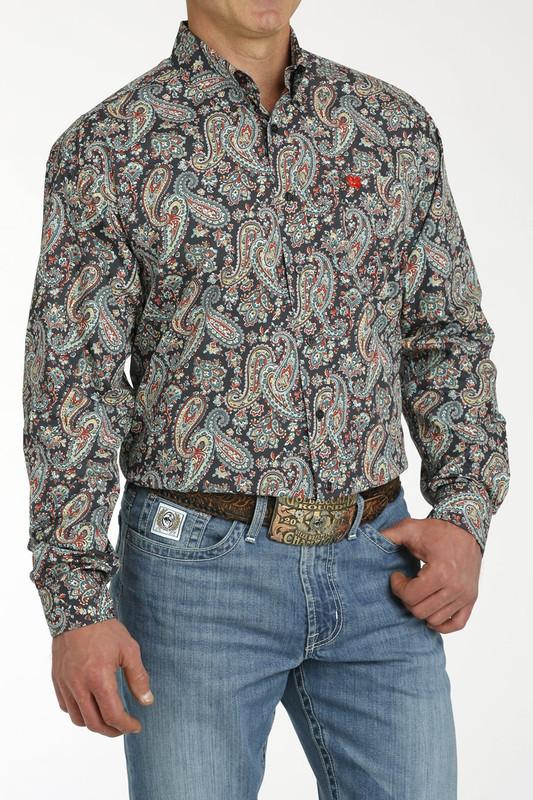 This charcoal, tangerine, & pale turquoise paisley print long sleeve Western shirt is a classic print with a modern twist. Cinch added stretch to move with you, this Western shirt provides the room and range of motion needed for riding and swinging a rope or just living life. There are too many to choose only one. Start with this one. Cinch brings Western home.