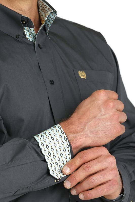 Cinch has solids with a twist, like this classic charcoal cotton plain weave with multicolor geometric contrast trim. Liven up any blue jeans in the stack with this seasonal must-have that features an open left front pocket with embroidered logo and trendy charcoal square buttons.