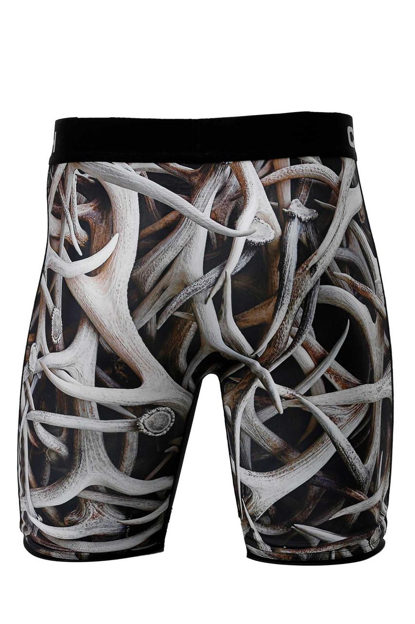 Just in time for elk season CINCH offers an impressive selection of novelty underwear like this 9 inch pair of poly-spandex briefs with elk and antlers motif. Multicolored poly-spandex knit construction includes no-ride leg seams, tag-free design, jacquard waistband with logo, antimicrobial treatment and four-way stretch moisture wicking fabric.