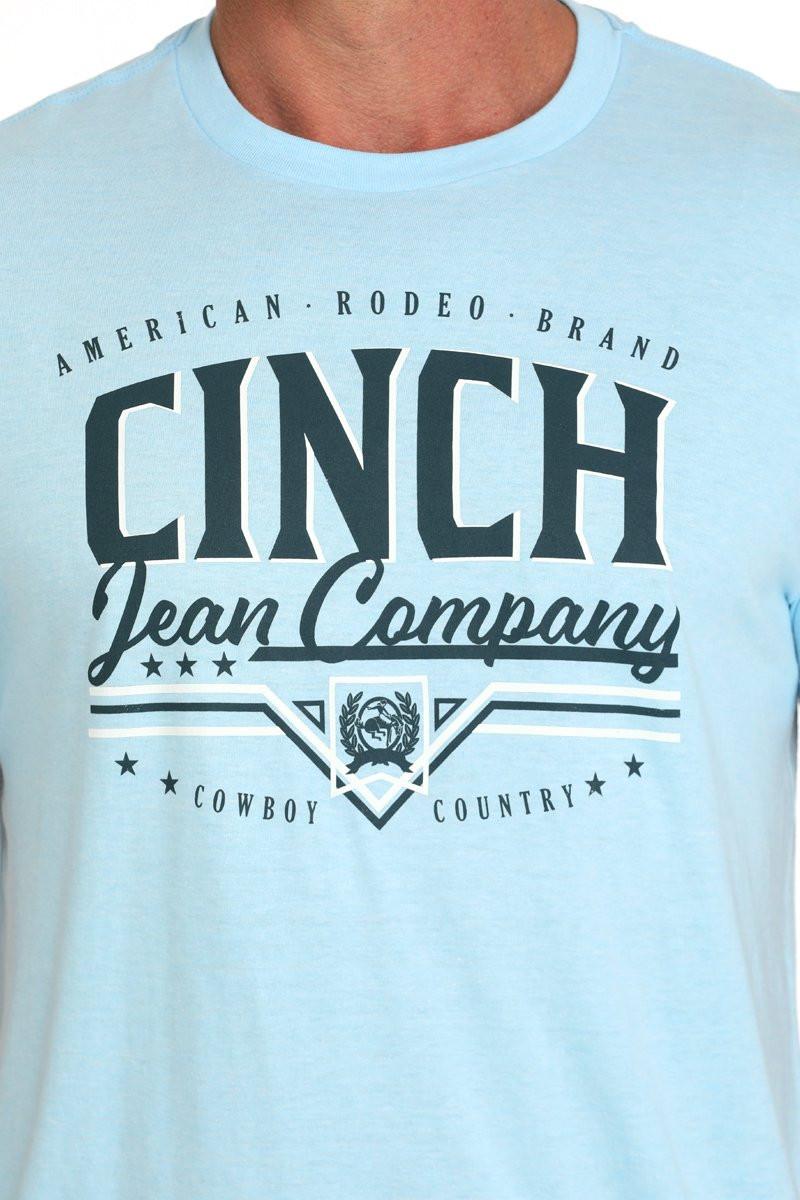 Whether you're riding, roaming, or relaxing, this light blue CINCH Jean Company crew neck tee shirt paired with blue jeans and boots will get the job done. Comfortable cotton-poly construction features standard tee styling and a front screen print.