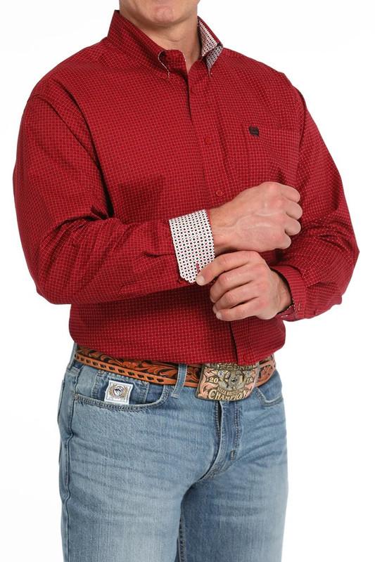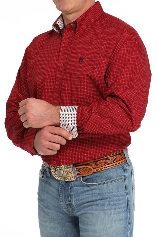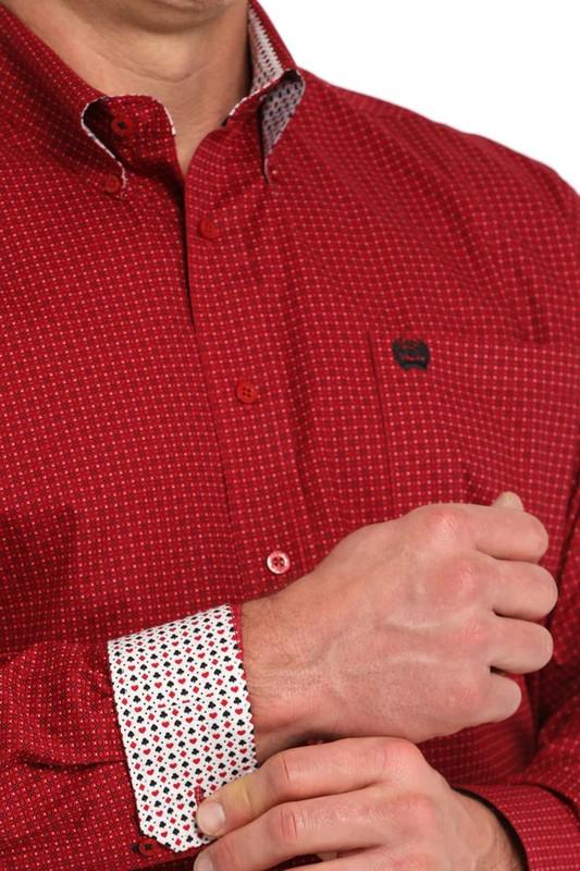 Upgrade any jeans and boots outfit with this handsome red geometric printed cotton plain weave engineered by CINCH. Design features include playing card contrast trim, an open left front pocket with embroidered logo and brown buttons.