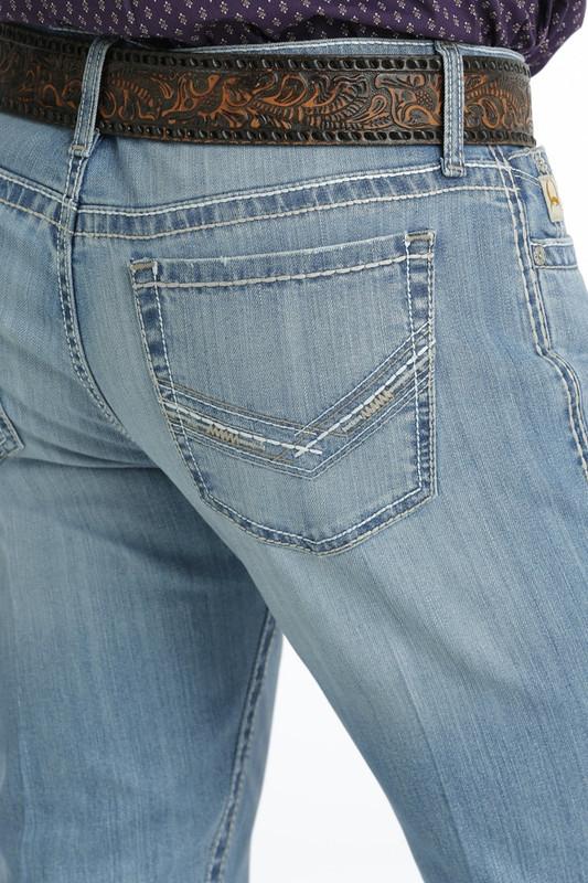 Cinch men's jeans are tough and durable for the rodeo arena or life on the ranch, yet fashionable enough for a night on the town alongside a western shirt. Cinch jeans are exactly the durable style you need. Step into spring with an all-new light stonewashed IAN. Taupe and cream embroidery intersect the back pockets, while hand sanding, whiskers, chevrons, knee starbursts and grinding boost an 11 oz. performance denim.