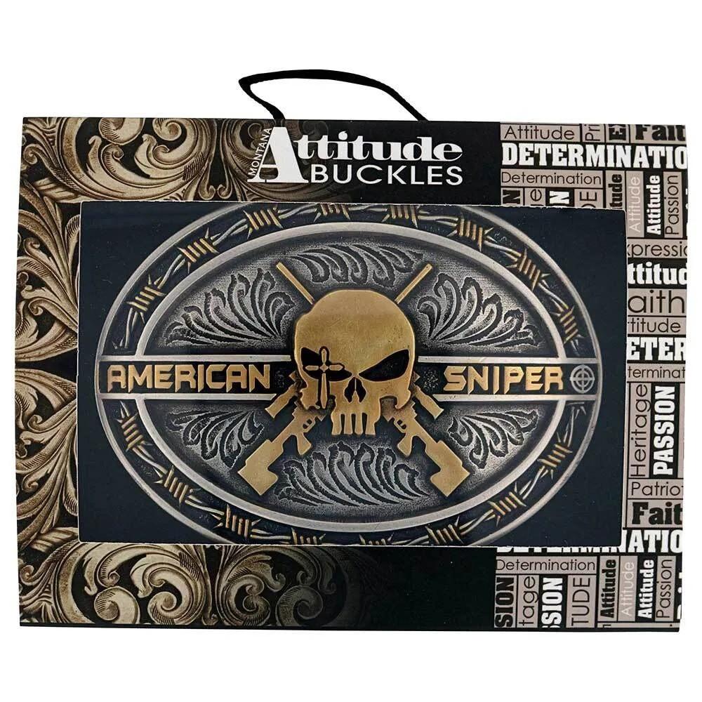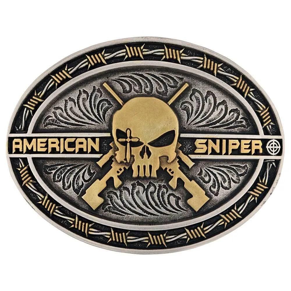Two gold tone rifles cross in an X overlaid by Chris Kyle's logo of a skull and cross hair is the highlight of the Cover Fire Chris Kyle Attitude Buckle. On either side of this design finished in gold are the words "American Sniper". The buckle is a deep gunmetal color with etched filigree filling the background and a two-tone barbed wire design bordering the entire piece. This buckle is a dynamic display of patriotic pride. Standard 1.5 inch swivel.