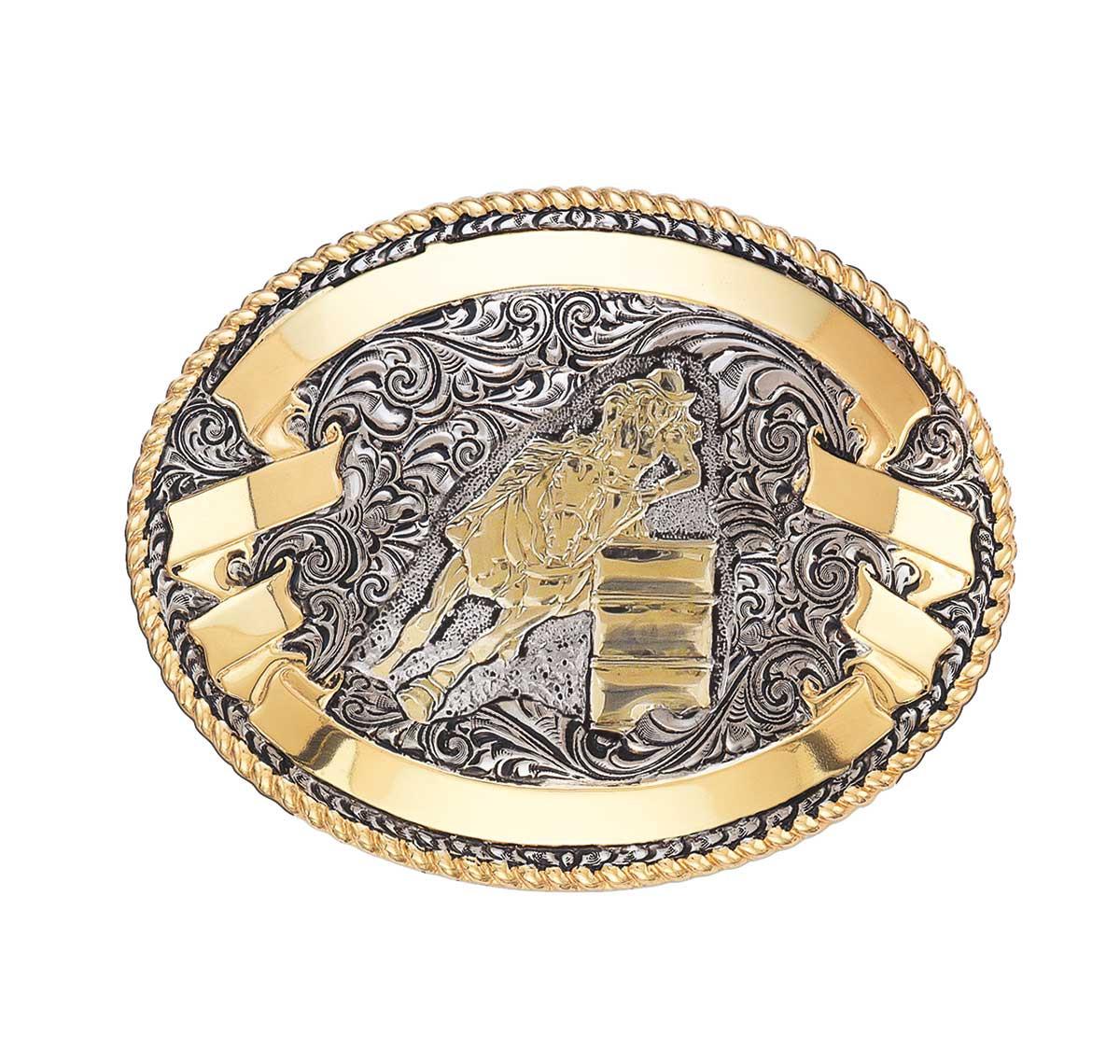 Oval Crumrine buckle in silver and bronze , four ribbons for engraving and floral design around motif.