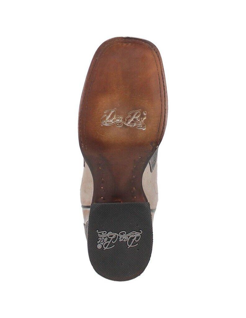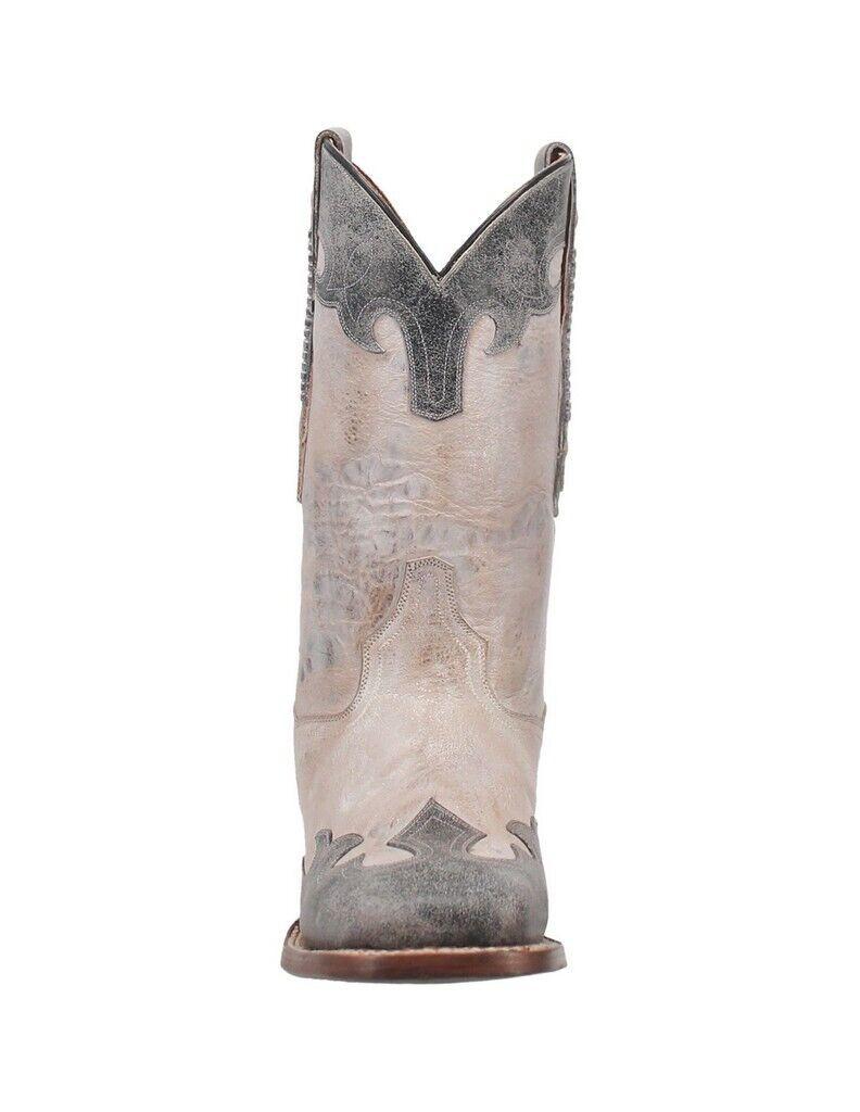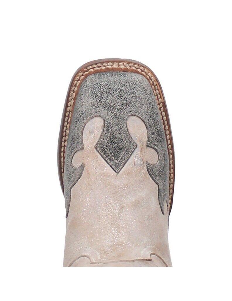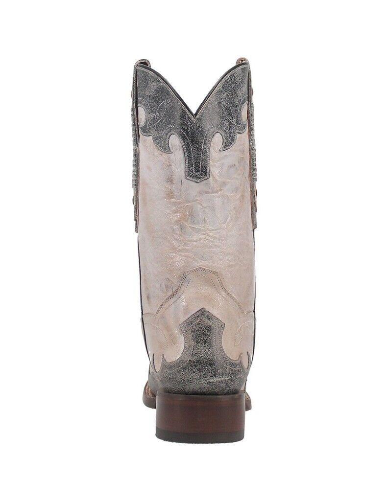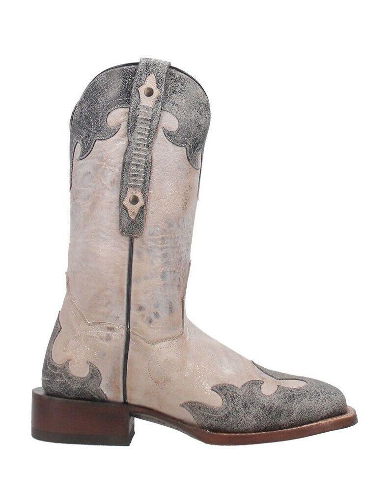 The rich bone leather is accented with charcoal overlay design. Hand-lacing and stud details on the pull strap for added pizazz. Popular broad square toe and stockman heel.