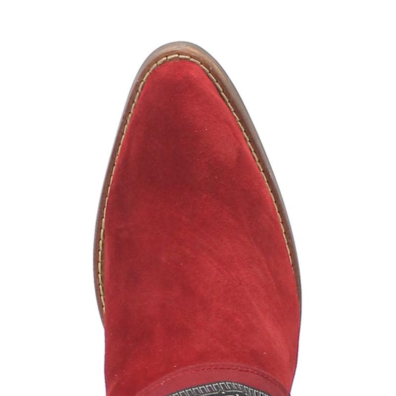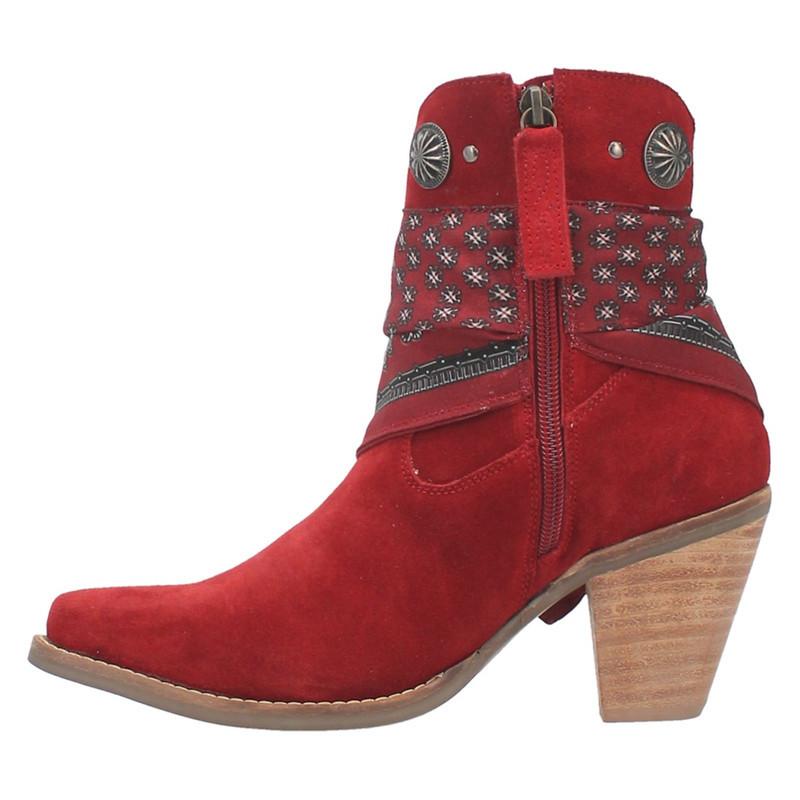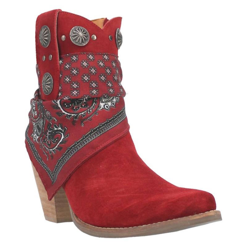 Get wild with reckless abandon in our Bandida boot from Dingo 1969. Meant for those with a restless spirit, this 7-inch bootie features a 3-inch heel, gorgeous metal medallions and bandana wrap detail, you simply cannot go wrong with the Bandida. Meet the Bandida Boots! Designed by Dingo, she comes in a rainbow of colorways, but we sure are loving this red hot option! That suede leather is oh so luscious, the silver medallion studs add a little edge, and the Pièce de résistance - those fun bandana wrap details! The short silhouette is fierce and fun, complete with a sassy stacked heel, convenient interior zippers, finished with a chic round pointed toe. Grab the Bandida Boots for a cute and trendy country western look!