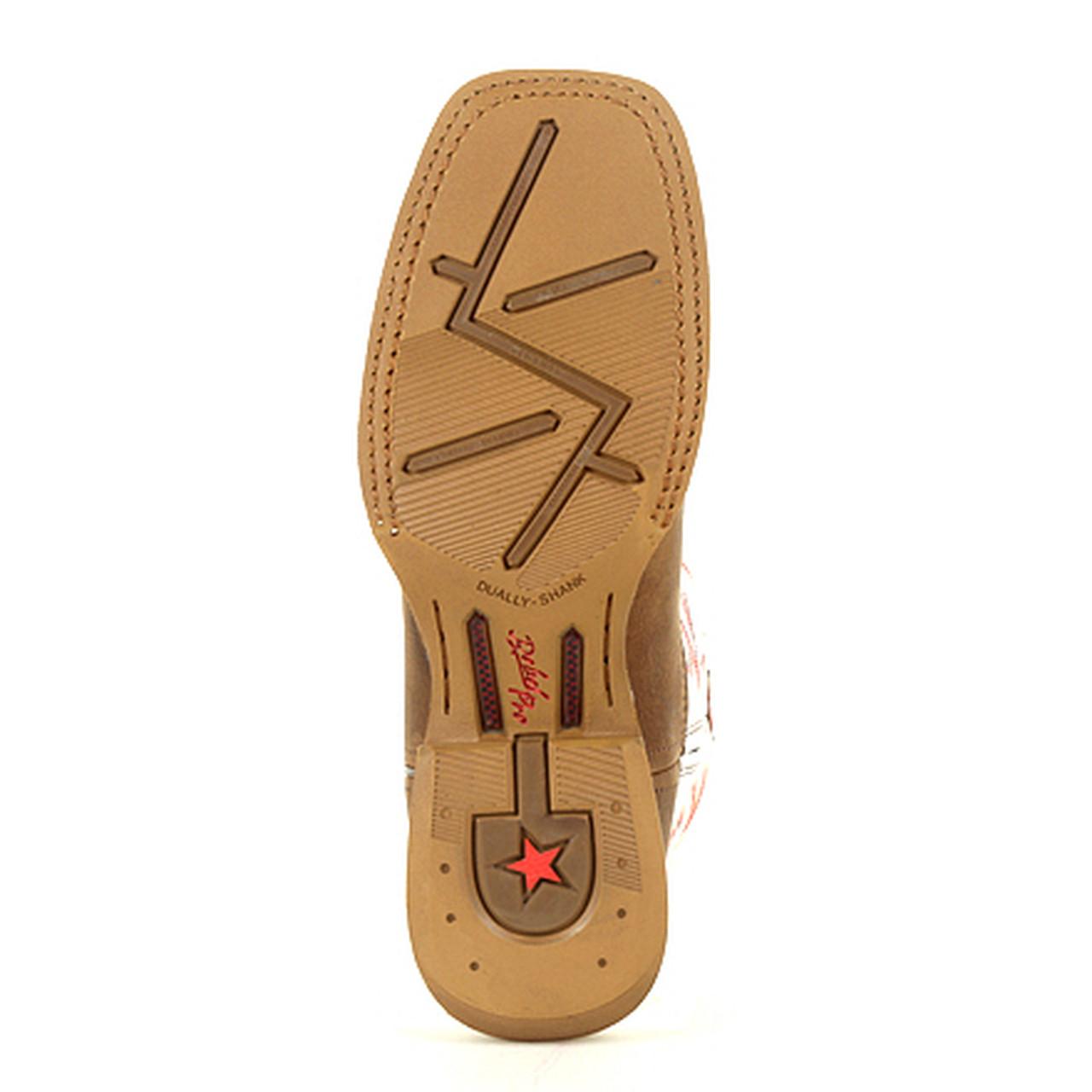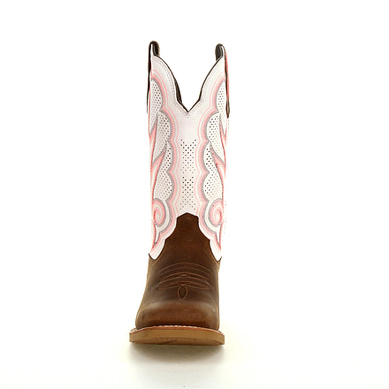 This is the women's 12" Western Trail Brown/ White Ventilated Durango® Lady Rebel Pro™ style. This style is full grain leather with a soft mesh lining inside and has the Durango® X-Pand System™ which is a hidden gore expansion for universal fit and easy on off. This style contains a comfortable 7-layer comfort system. The first layer is the Durango® X-Treme Comfort Footbed™ with memory foam for all day comfort and support. The second layer is an EVA cushion layer that contours and molds to your foot. The third layer is a ¾ genuine Goodyear® welt construction and a genuine leather welt with double row cotton stitch. The fourth layer is a two-layer innersole with a flexible full-length bottom and stabilizing rigid ¾ heel tuck. The fifth layer is the patented Dually Shank System™ which contains two fiberglass shanks for medial and lateral torsion stability and midfoot support. The little way stitch binds the outsole, heel tuck, and upper for absolute durability. The sixth layer is the ABS heel base which is nailed-weight relieved for lightweight durability. The seventh layer is the slip, oil and abrasion resistant rubber outsole that offers instant gratification. The 1 ½" rocker heel lessens stress by promoting a more natural heel strike and the rolled shank area is perfect for stirrup- friendly ease. Unbridle your western spirit in the women's 12" Western Trail Brown/ White Ventilated Durango® Lady Rebel Pro™ style; the perfect boots for performance-driven individuals. Get a pair today!