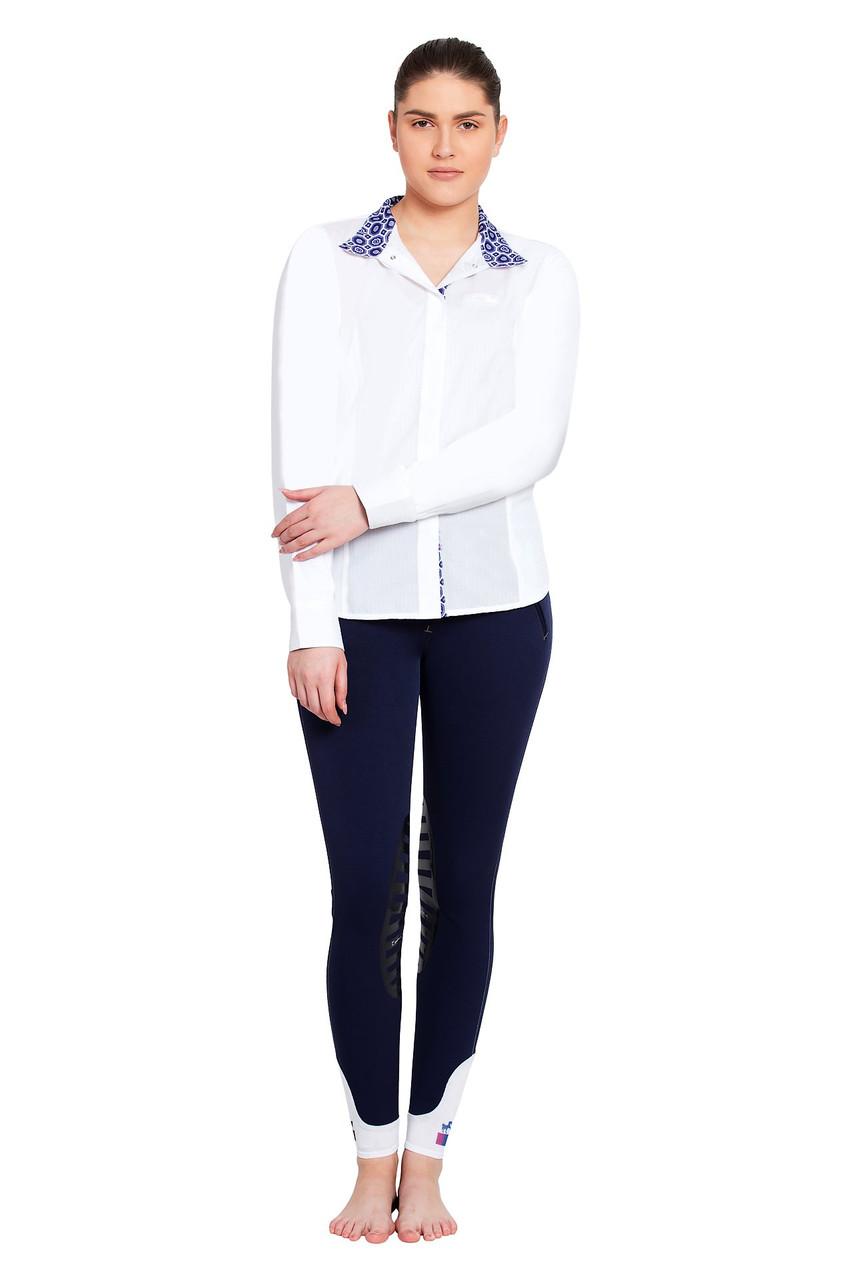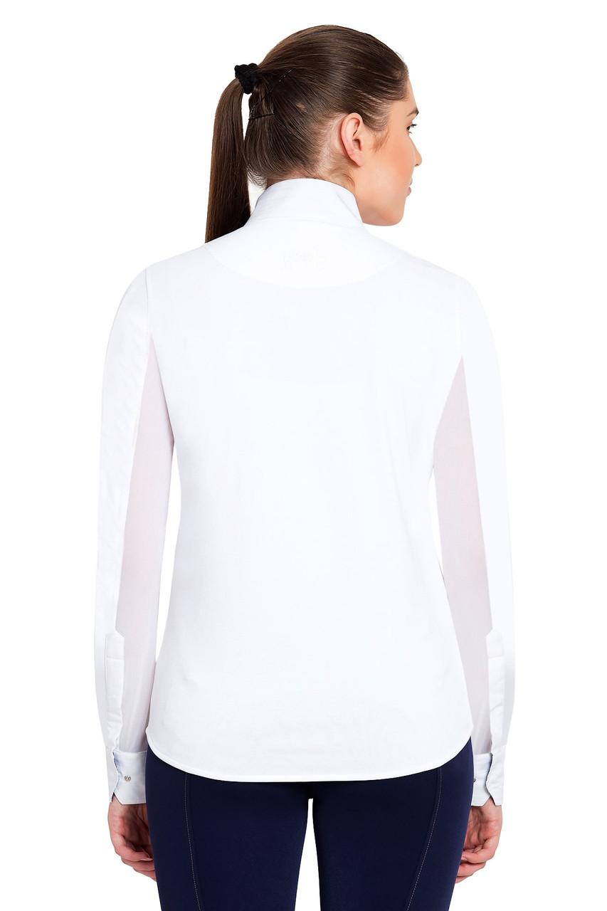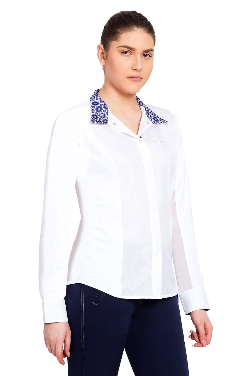 The Equine Couture Ladies Kelsey Long Sleeve Show Shirt is a fun option for any show ring! The geometric print in bright colors lines the collar, buttons, and cuffs, making it easy to hide for the show ring, but it can also be shown off when you're hanging around the showgrounds. The woven Coolmax material wicks moisture away from the body and the ventilated mesh underarm panels provide additional cooling for the warmest competition days. Part of the Equine Couture collection, these show shirts are a fashion-forward choice. Equine Couture features integrated fabrics for comfort and equestrian-themed styles that makes these riding products fashion-forwar