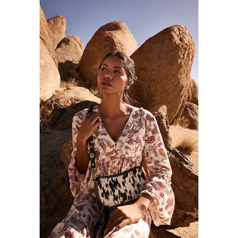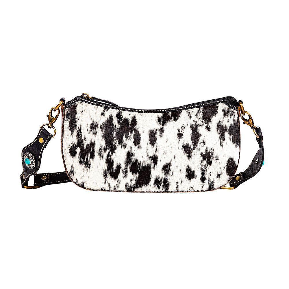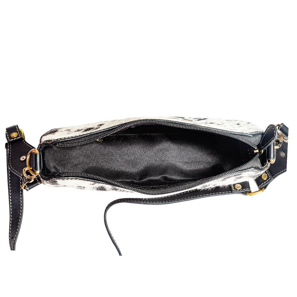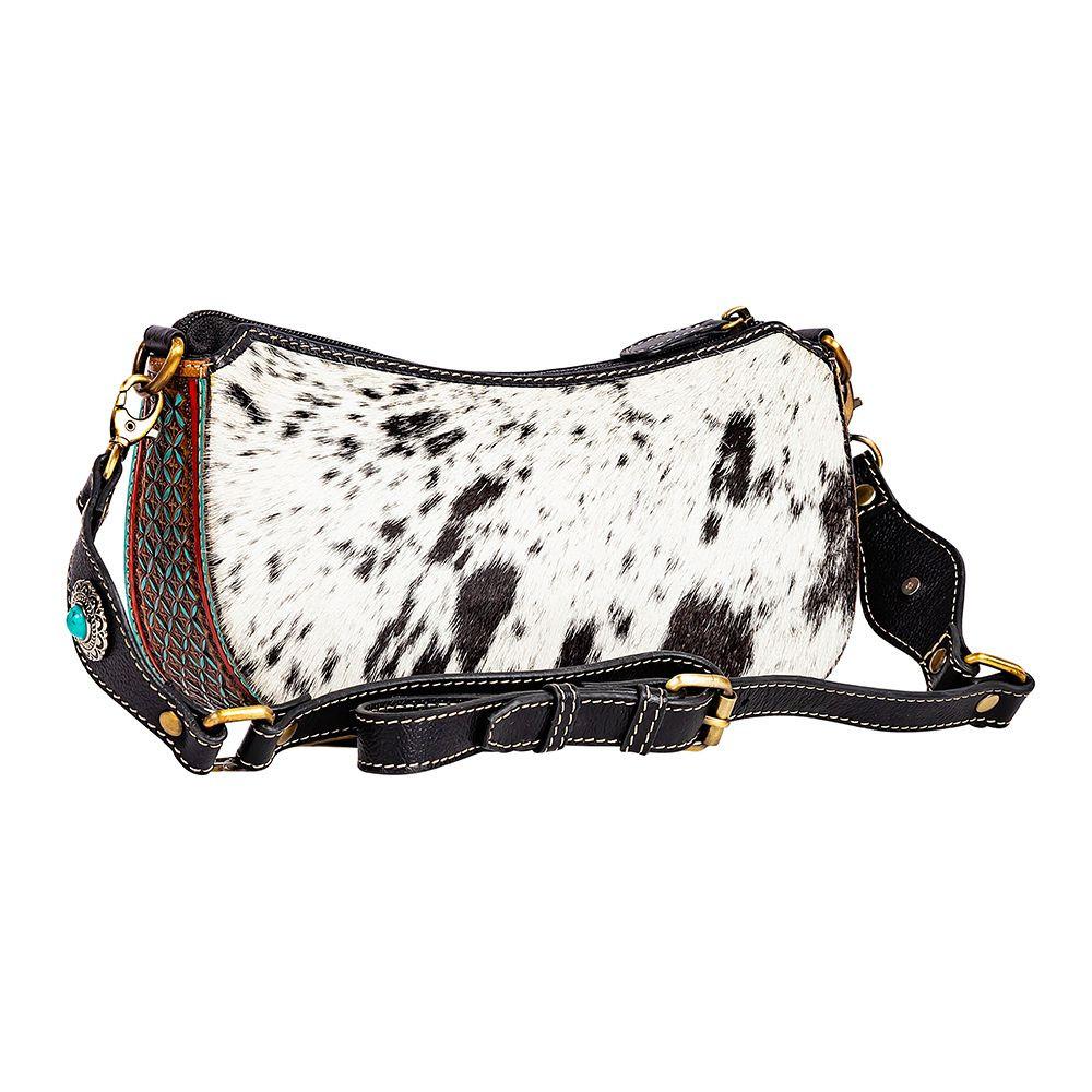 Great style and remarkable design impart this bag with a remarkable, sophisticated look. It features beautiful hair-on hide on both sides, paired perfectly with ebony leather. The adjustable, removable shoulder strap is in matching ebony leather and features metal Conchos on each side. A great bag for any occasion.