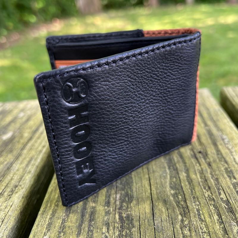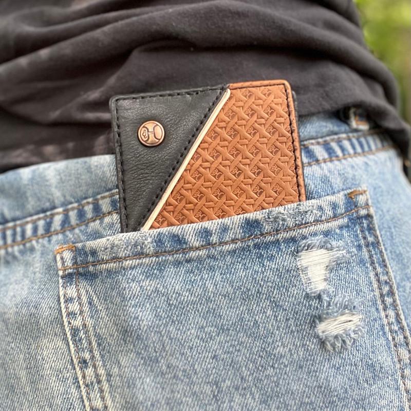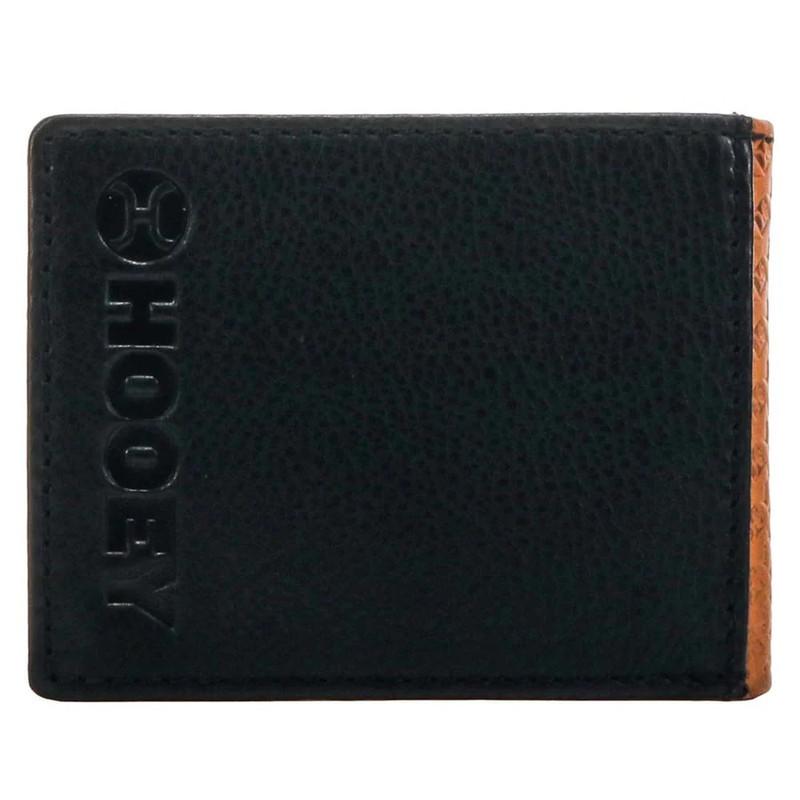 This Hooey front pocket bifold wallet features a basket weave detailed exterior and black interior with black leather corner overlay and includes our custom hooey brand woven logo liner.