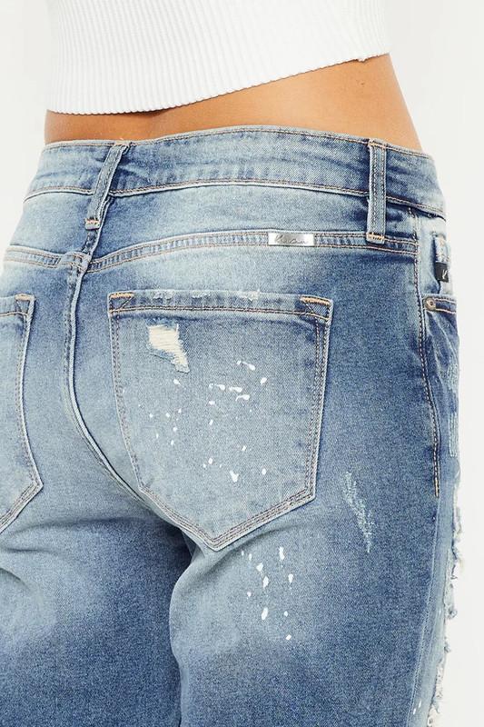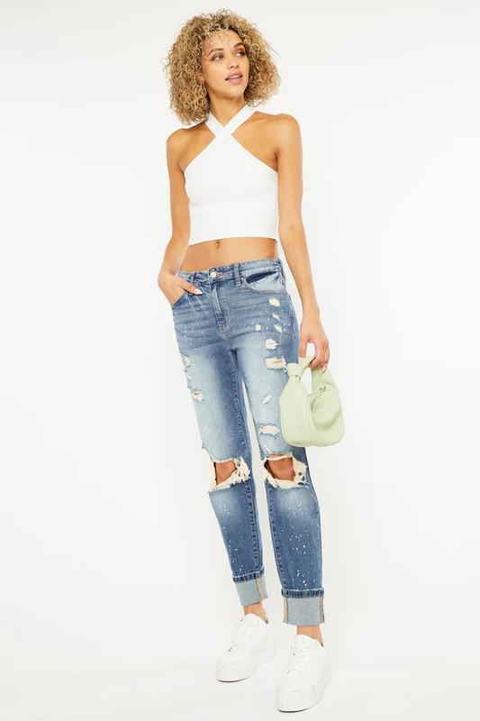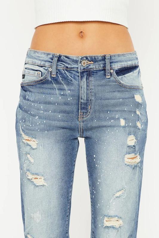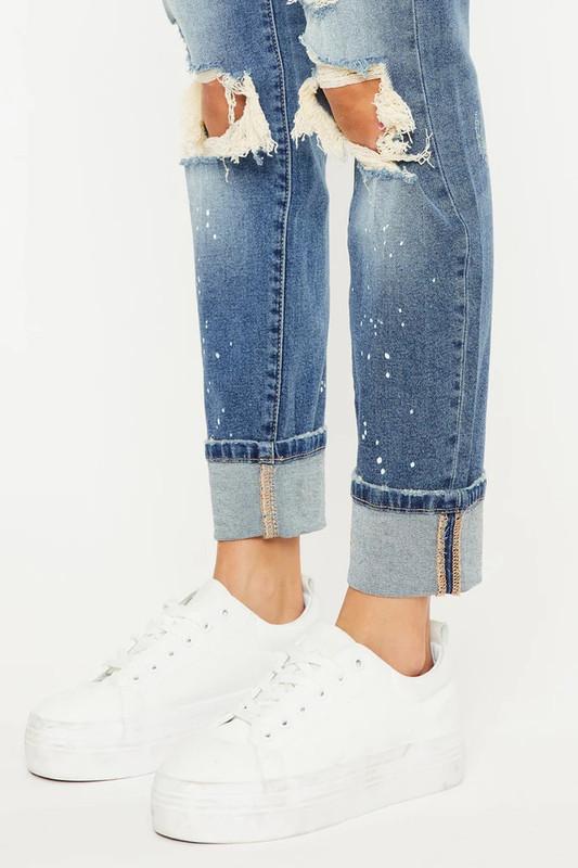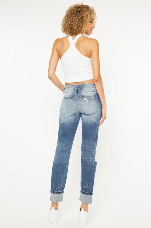 This isn't your ordinary pair of boyfriend jeans! Bring out your playful side when you're rocking our Shelley jeans that come with plenty of unique details! Features fading, whiskering, distress, paint splatter, folded hem, 5-pocket design, and a single button closure with zip fly.