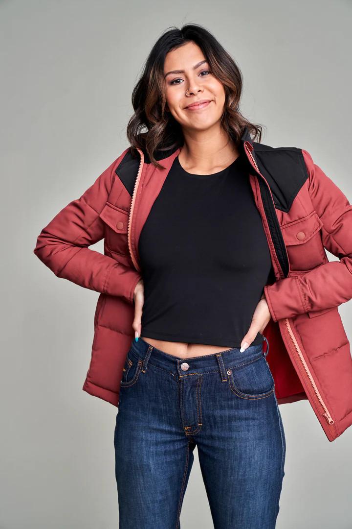 Details: Quilted Puffy Jacket with western yokes. Zip front with snap chest pockets, and welted hand pockets