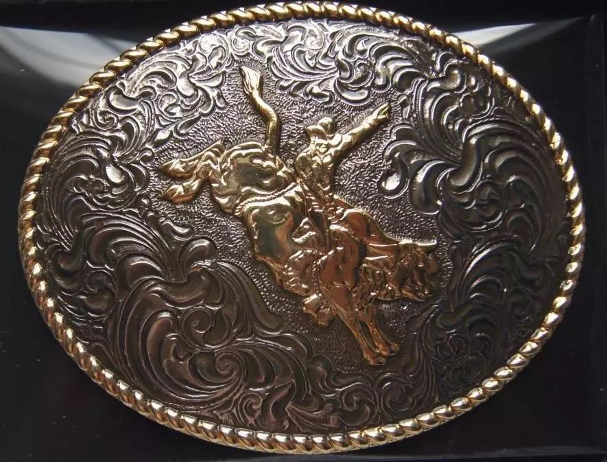 Deck out your favorite western belt with one of our Crumrine belt buckle! Silver & Gold tone with a BULL RIDER featured at center Beautifully crafted buckle with Western Scroll.