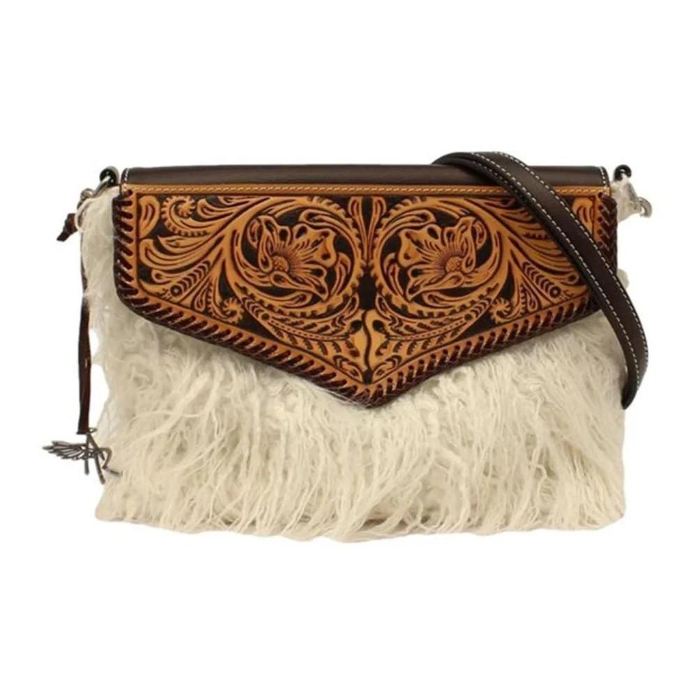 When you need a good handbag Angel Ranch by M&F Western has you covered. This women’s crossbody bag is made with fuzzy, ivory angora material. It has a floral tooled flap and closes with a snap closure. It has 1 interior pocket and 1 zippered pocket.