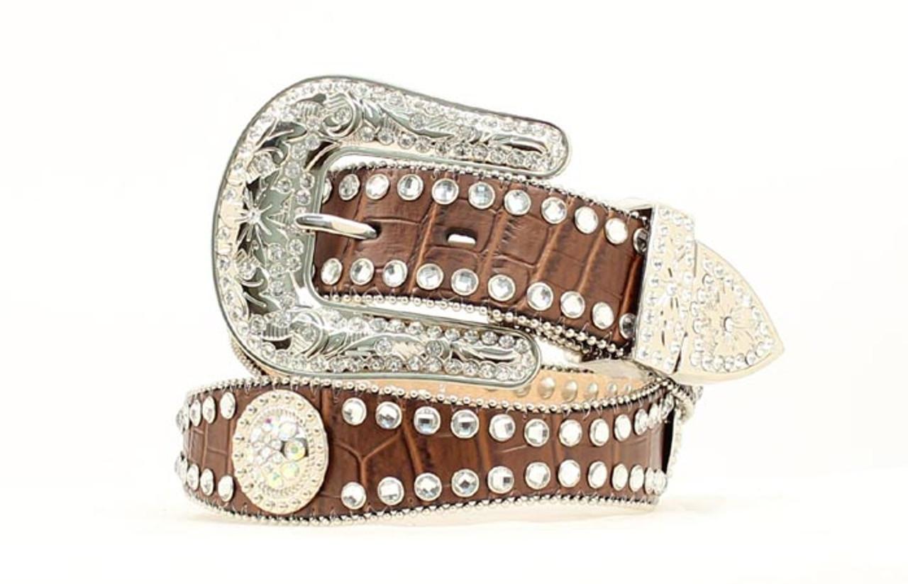 You’ll enjoy a chic western look with this great Blazin Roxx belt by M&F Western Products®. This belt features brown croc print leather with scalloped edges. It has beautiful rhinestone conchos as well as rhinestones that run the edges of the belt for tons of bling. Removable silver buckle. Women's Blazin Roxx Belt: Ladies Blazin Roxx Western Belt. If I had a nickel for every “bling” stone…. I’d be rich! This gorgeous Blazin Roxx women’s belt features a full grain leather scalloped design; covered in clear crystals, rhinestones, and silver stud detailing; lovely crystal round conchos; and a stunning crystal floral tooled removable buckle, tip and keeper. 1.5 inches. Women’s Belt sizes: S=30", M=34", L=38", XL=42", Plus=46”: measurements from middle hole to folded belt end at buckle. Women’s Belt lengths excluding buckle: S=36", M=40", L=44", XL=48": length is measured from end of the buckle where strap starts to the tip of the belt. Buckle gives you additional 2 inches approximately and last hole is about 8 inches from the tip of the belt. There are five holes for most styles, giving a four inch range of fit. Measure your waist or hips exactly where you will wear the belt, including jeans, or pants.