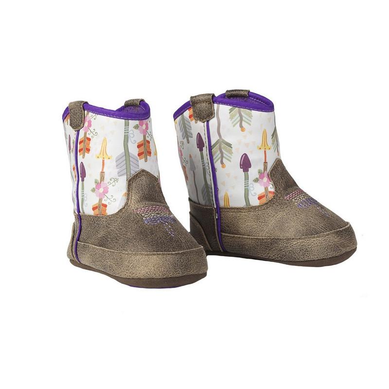 Your little one is sure to be a charmer with these Blake baby bucker boots by M&F Western Products. Flower print shaft that is decorated with purple piping and boot pulls. Side Velcro closure for easy on/off. So comfortable that your little cowpoke will want to wear them all day.