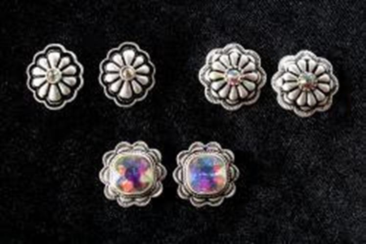 3 pair of beautiful Silver Strike ladies earrings by M&F Western Products. Aurora borealis crystal in the center. All on posts.