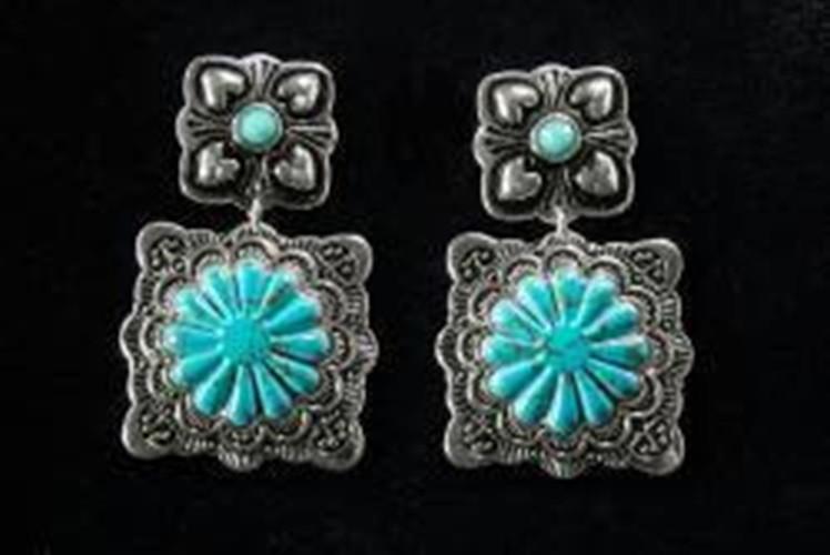 Beautiful Silver Strike ladies earrings by M&F Western Products. Scalloped square design with turquoise stone centers. Post style for easy on/off.