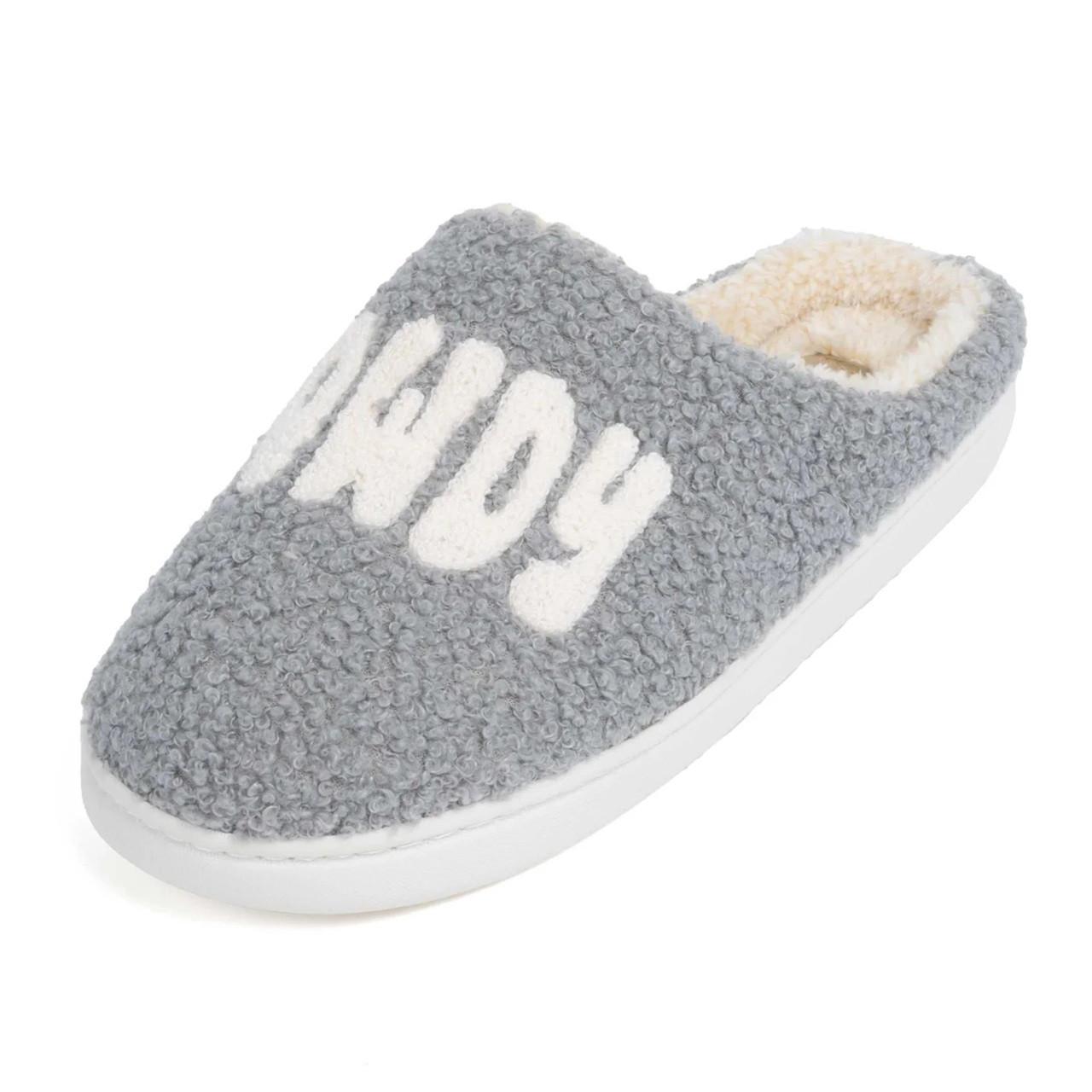 Grey Howdy Tops with cozy fleece lining, easy slip-on design, and a durable non-slip rubber sole.