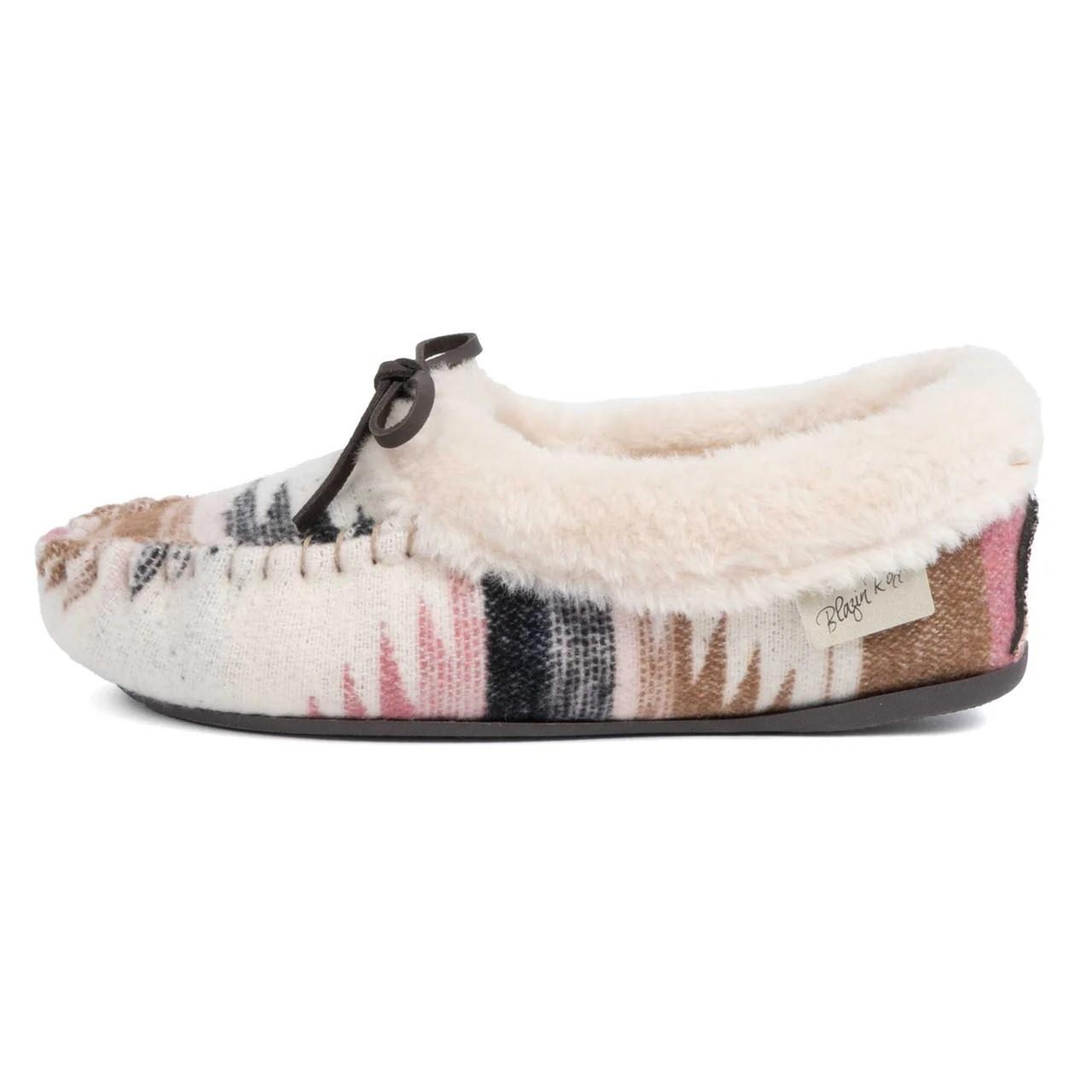 These Ariel Moccasins feature a cozy faux fur lining, a secure top tie, and a non-slip rubber sole, all wrapped in a stylish Pink Aztec Print to keep you comfortable and steady throughout your day.