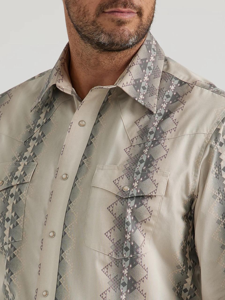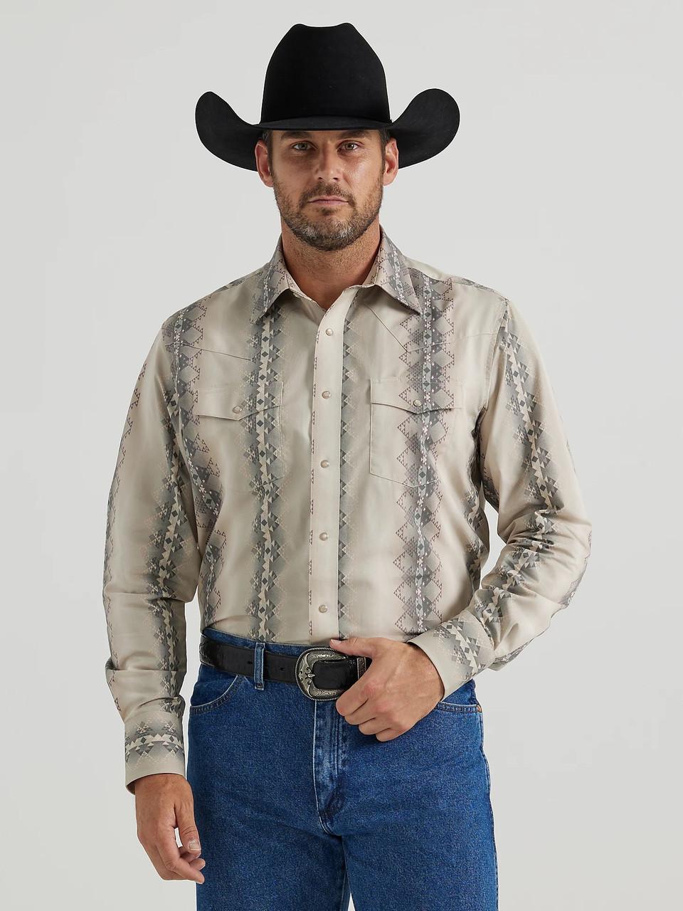 Wrangler's Checotah® has a home in the closets of cowboys around the world. This men's Checotah long-sleeve western snap Navajo-inspired printed shirt is designed to make a statement no matter the destination. It features a classic fit, a spread collar, pointed yokes, two snap flap pockets with a convenient pencil slot, adjustable cuffs, and a full-length snap closure for the finishing touch. Best of all, it's crafted from cotton for uncompromising comfort. Look sharp at a moment's notice by wearing your Checotah shirt with a Wrangler Retro® or Cowboy Cut® jean.