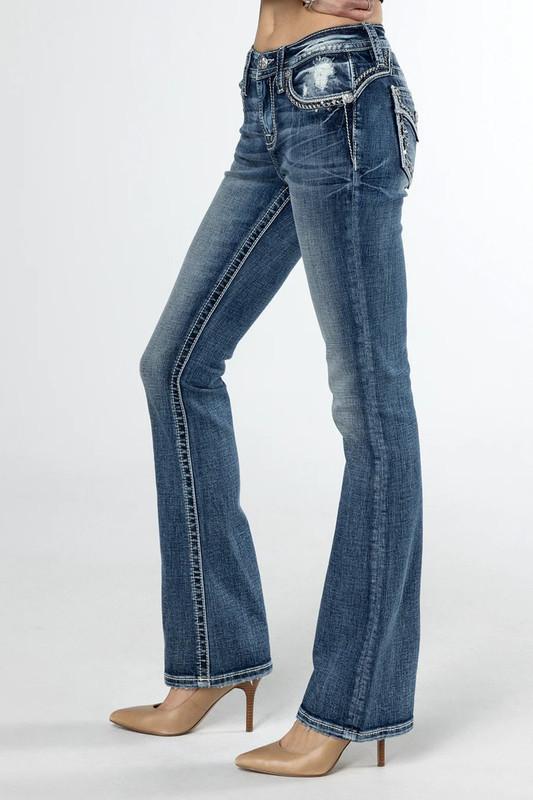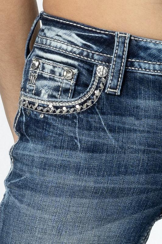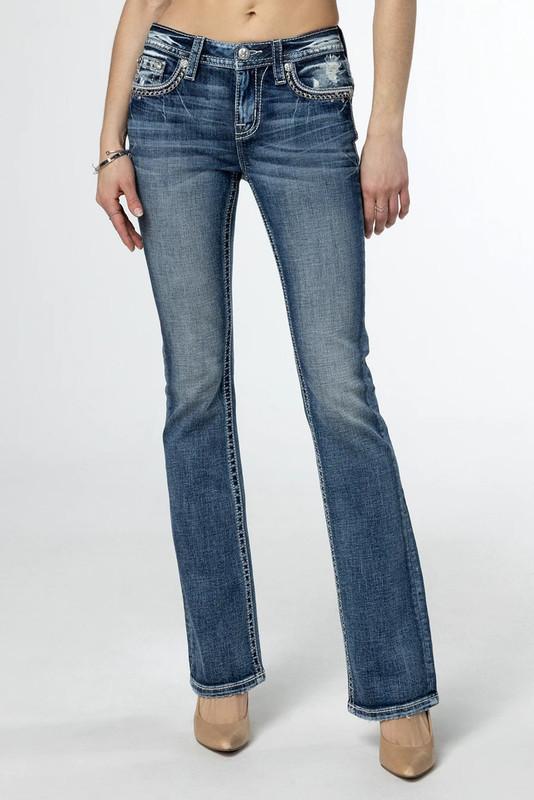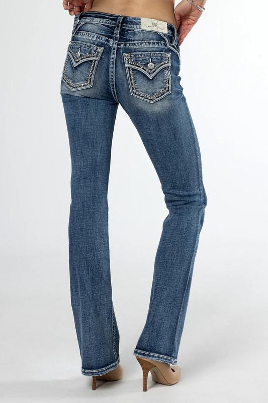 These Miss Me mid-rise bootcut jeans feature a medium dark-wash and are adorned with silver, gold, and white looped stitching along the back pocket. The faux flap pocket design is accented with mini rhinestone rivets and silver sequins. Rhinestone rivets and an embossed white leather M logo brand patch give these jeans a stylish touch.
