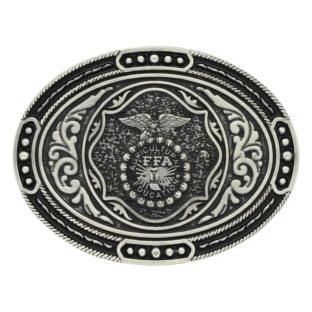 An antiqued silver toned Attitude buckle with a center FFA logo surrounds by scalloped and circle frames and sides of filigree. Stitch-like edging with groups of five microbeads create the edging. 1.5 swivel.