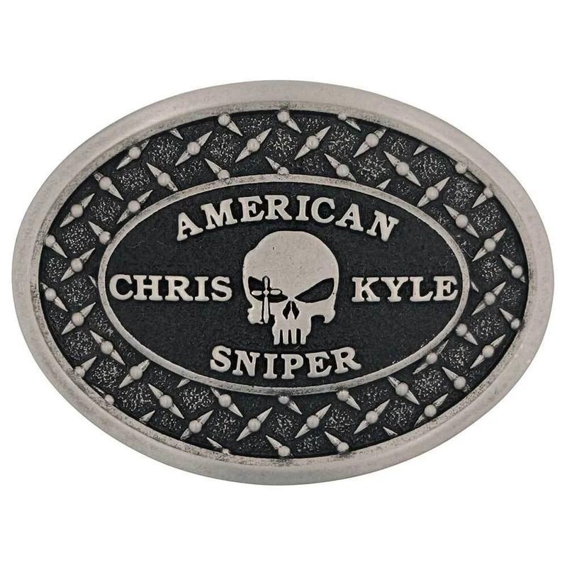 Chris Kyle's logo of a skull with a sight over one eye sits in the center of the Sniper Chris Kyle Attitude Buckle. On either side of this buckle is "Chris Kyle" with "American Sniper" split between the top and bottom. A raised silver tone diamond plate pattern over deep gunmetal fills the space between the smooth silver tone border around the logo and the same smooth silver tone border that finishes off the buckle. Standard 1.5 inch belt swivel.?
