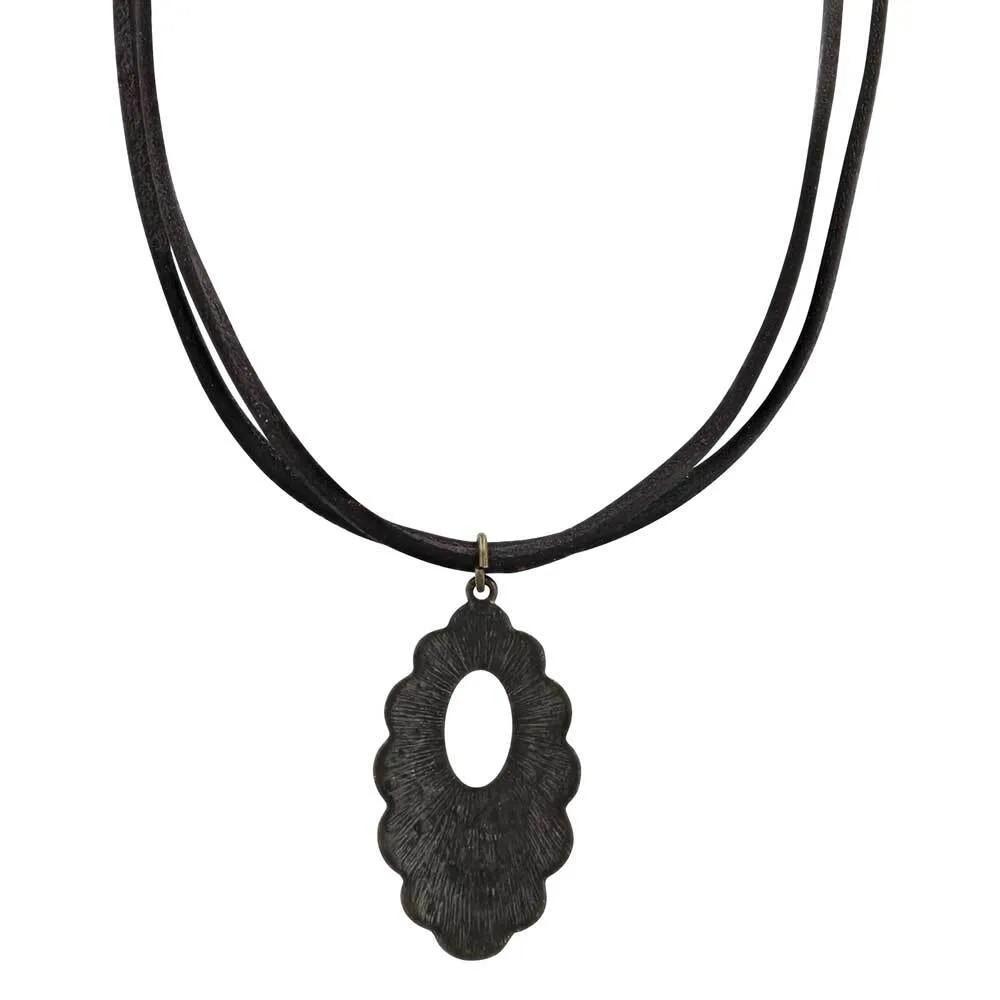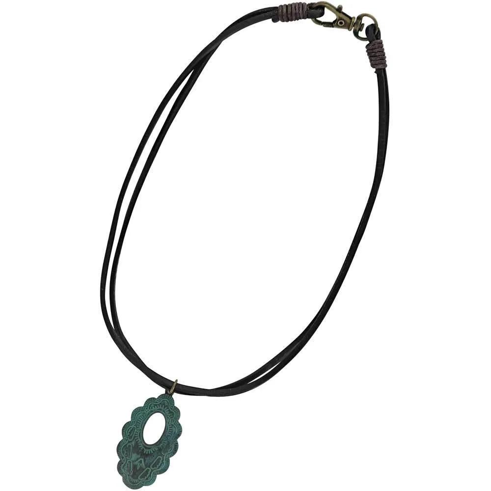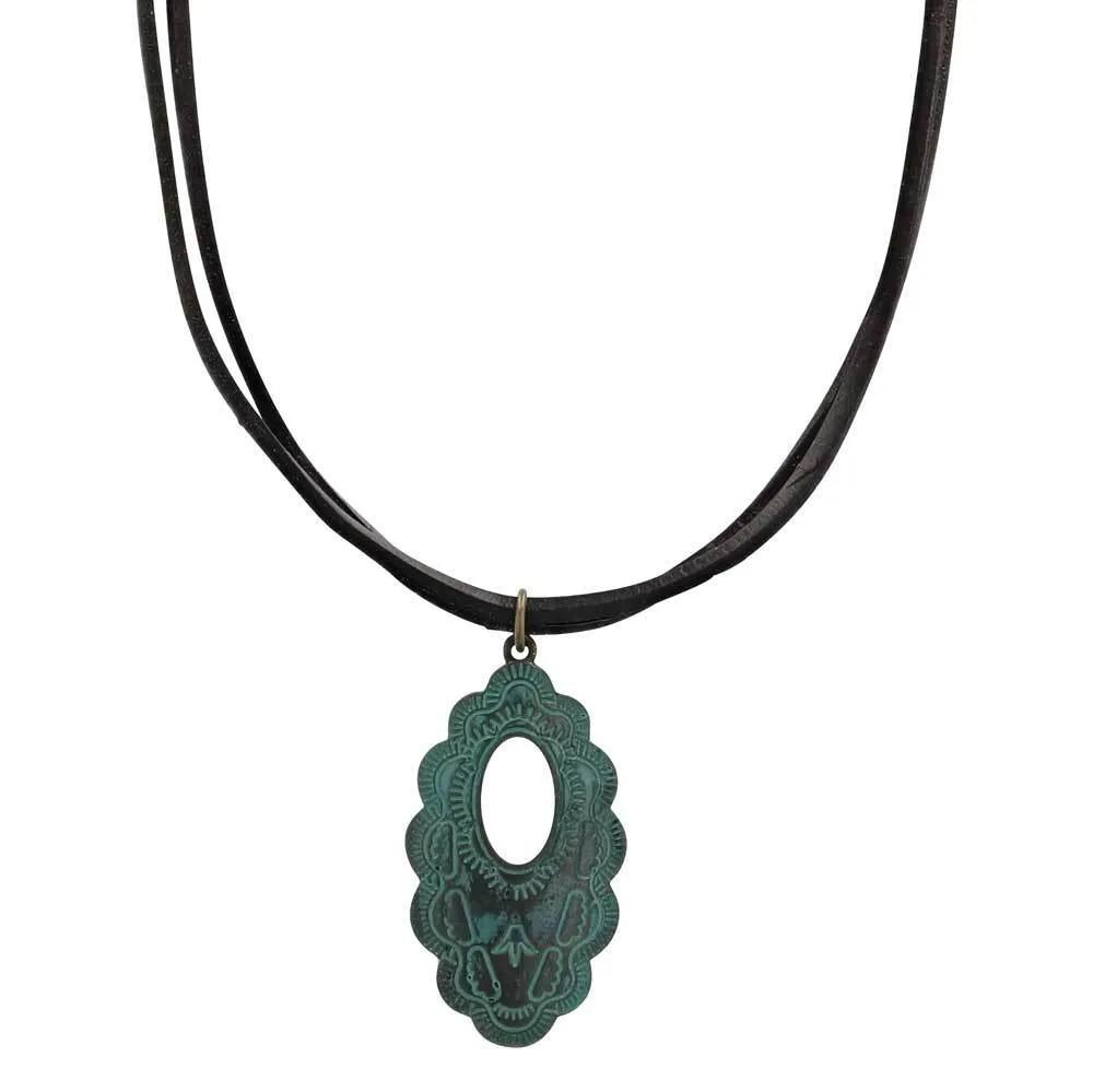 A double black leather cord makes up the loop of this Attitude necklace to measure 20 inches in length on the Scalloped Window Bronze Attitude Necklace. The pendant is oval with scalloped edges and bronze-colored with a radiating etched designs with an oval cut out in the upper section of the pendant. The whole pendant is antiqued with a turquoise color to give a worn and rustic look.