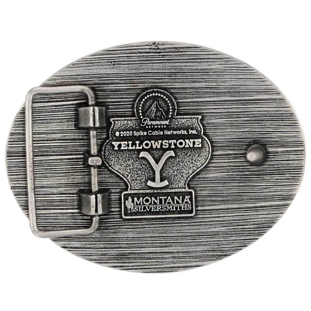 Inspired by the Montana based tv show Yellowstone from Paramount, this Strength of Yellowstone Attitude buckle is a must-have for any fan. The silver tone buckle features the Dutton Family Y brand at the top of the buckle. A longhorn is in the center of the buckle surrounded by filigree that fill the background. A rope edge finishes the strong design. Standard 1.5 inch belt swivel. SKU A960YEL