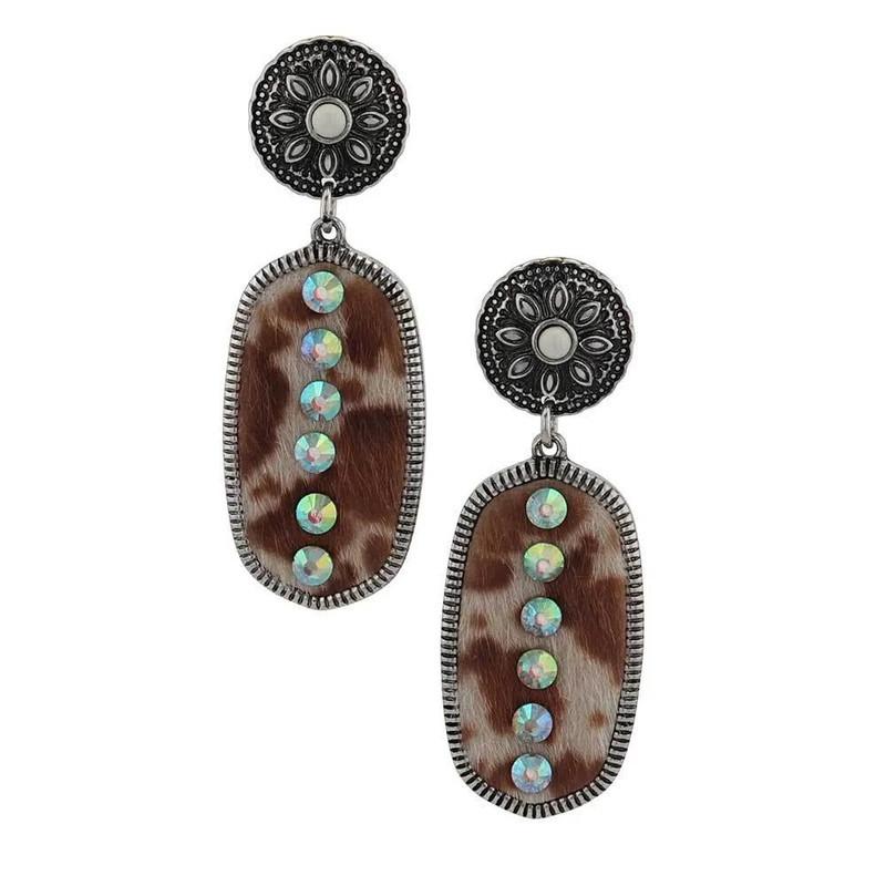 Bring the natural beauty of rural life with you wherever you go. These earrings feature brown and tan faux cow hide. On top of the fabric are holographic crystals in a vertical line for added glamour. Above the faux hide is a silver tone Concho with detailed etching and a white stone in the center, that attaches to post back wires to secure the earrings.