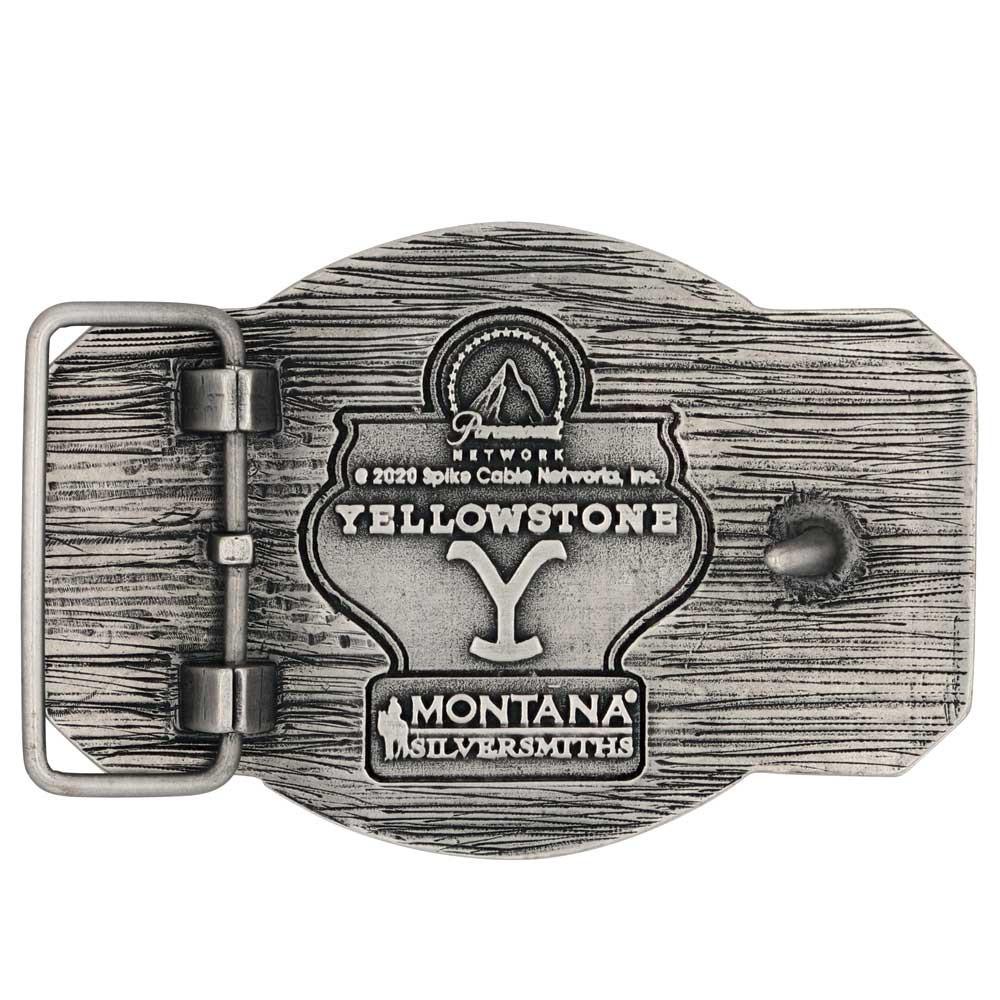 Our Dutton Ranch Attitude belt buckle is straight from the Dutton ranch in Montana. It is scalloped in shape with clipped corners. It has an antique silver background with black hand paint and gold toned trim. The face of the buckle says Dutton ranch ESTD 1886 Montana. It has stars in the corners for western style and a standard 1.5 inch belt swivel.