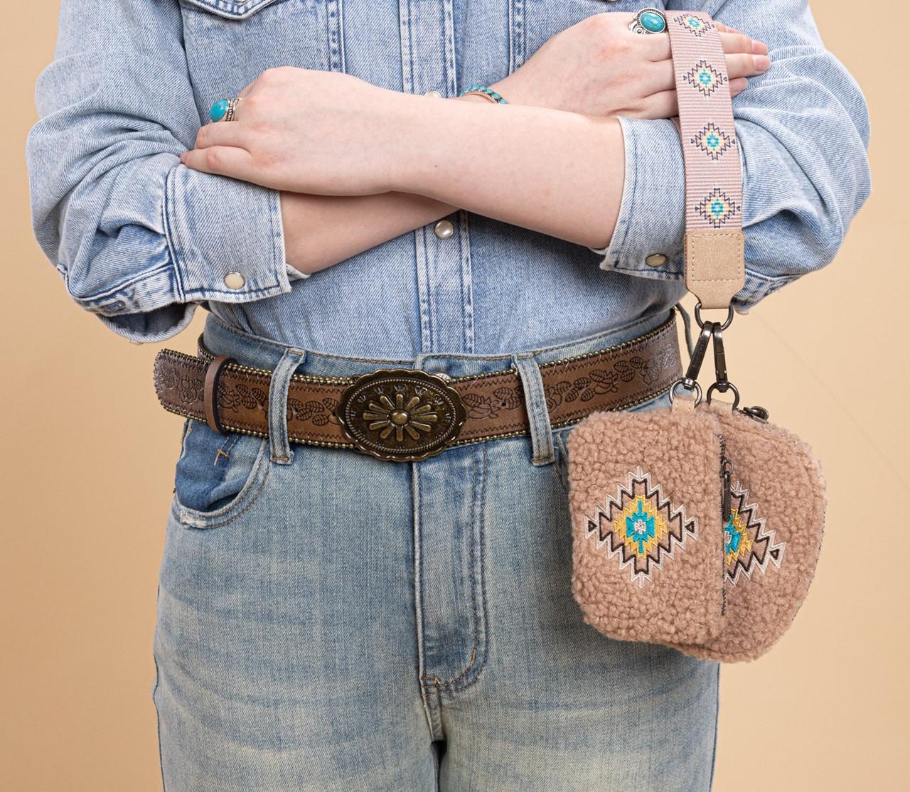 Montana West Wrangler Women's Tan Sherpa Embroidered Aztec Dual Pouch Wristlet
