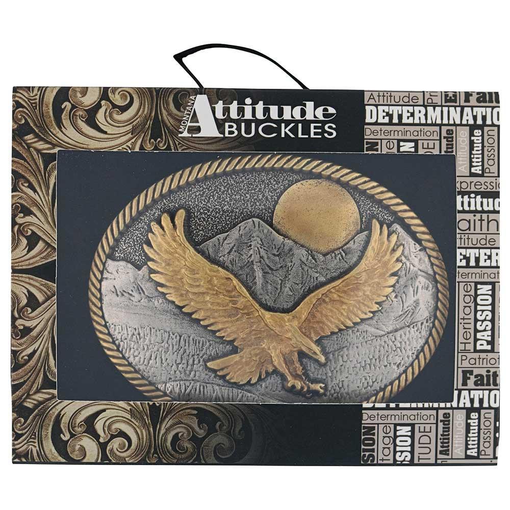 A striking gold tone eagle soars over a background of silver tone mountains. The Mountain Majesty Attitude Buckle also holds a gorgeous gold tone sun cresting over the detailed mountain image. The entire oval silver tone buckle is framed by a gold finished rope. Display this scene with pride every time it's worn. Standard 1.5 inch swivel.
