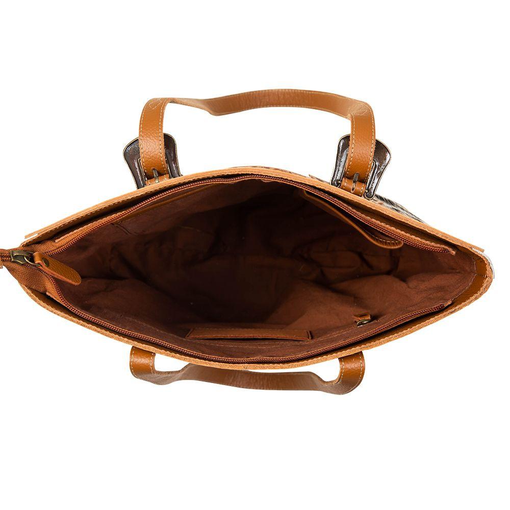 This alluring features a front of hair-on hide with beautiful accents of detailed, hand-tooled leather in a timeless pattern. The reverse is warm deep caramel leather, with zippered pocket. Spacious interior features handy section, a zipper-close top, and matching carrying handles. A striking bag for any occasion!