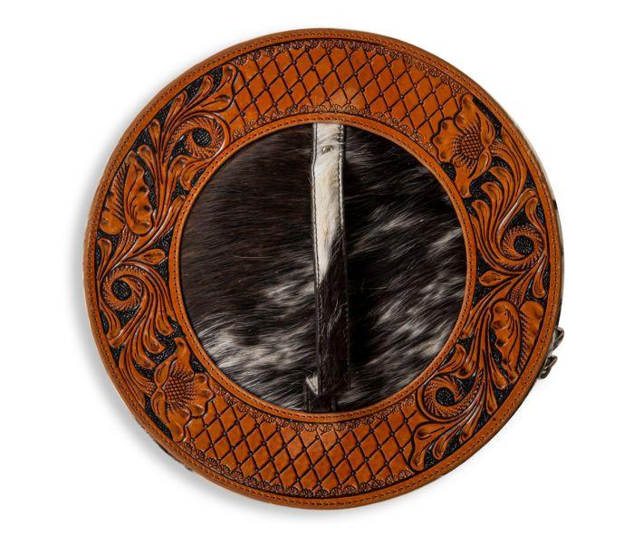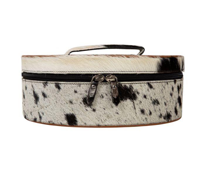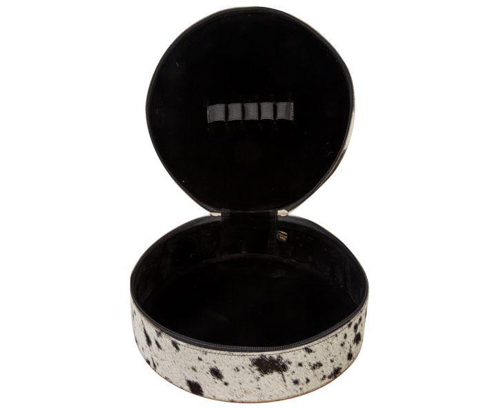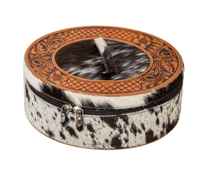 “Amazing!” is the word you’ll hear to describe this beautiful round jewelry box. The dark-toned hair-on hide and top of beautiful hand-tooled leather make for an utterly gorgeous combination. The zipper-open lid keeps everything secure, while black velvet lines the interior. Clear plastic outer case include. A dynamic and unique item!