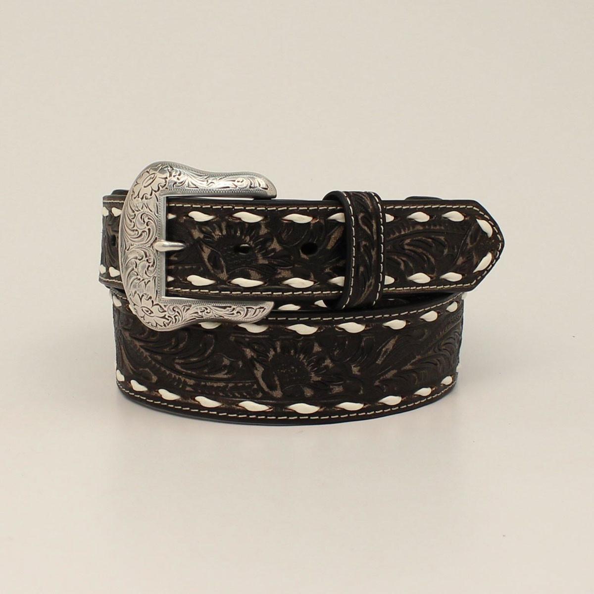 Quality men’s Nocona belt by M&F Western Products is made of genuine leather. It has a floral embossed pattern with a sanded, distressed look.