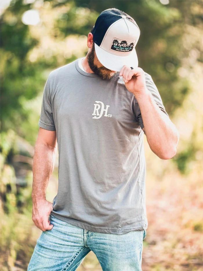 Men's solid asphalt blend t-shirt featuring the exclusive "Big Buck" design, as well as the signature RDH brand on the front.