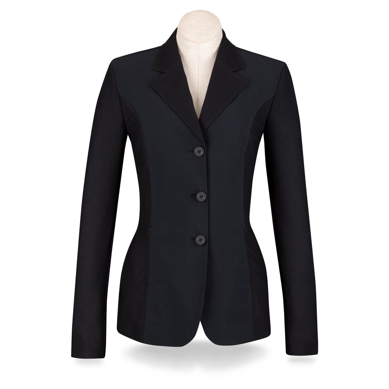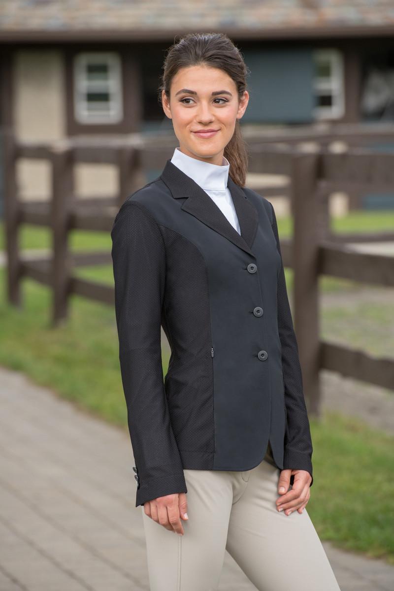 The Harmony 3-button mesh show coat, with its unique styling, offers the rider an elevated, athletic garment while maintaining the tradition of the sport. The lightweight mesh body fabric provides extreme comfort and breathability, while the Italian Jersey front panel offers a conservative contrast. Unique back seams provide a subtle twist, and vertical zipper pockets with locking pulls and matte logo buttons complete the ensemble. With traditional R.J. sizing options, you can expect the consistent R.J. fit!