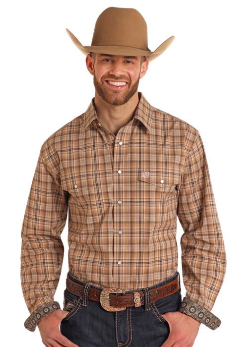 Rock & Roll Denim Panhandle Slim Men's Khaki Stretch Plaid Snap Shirt