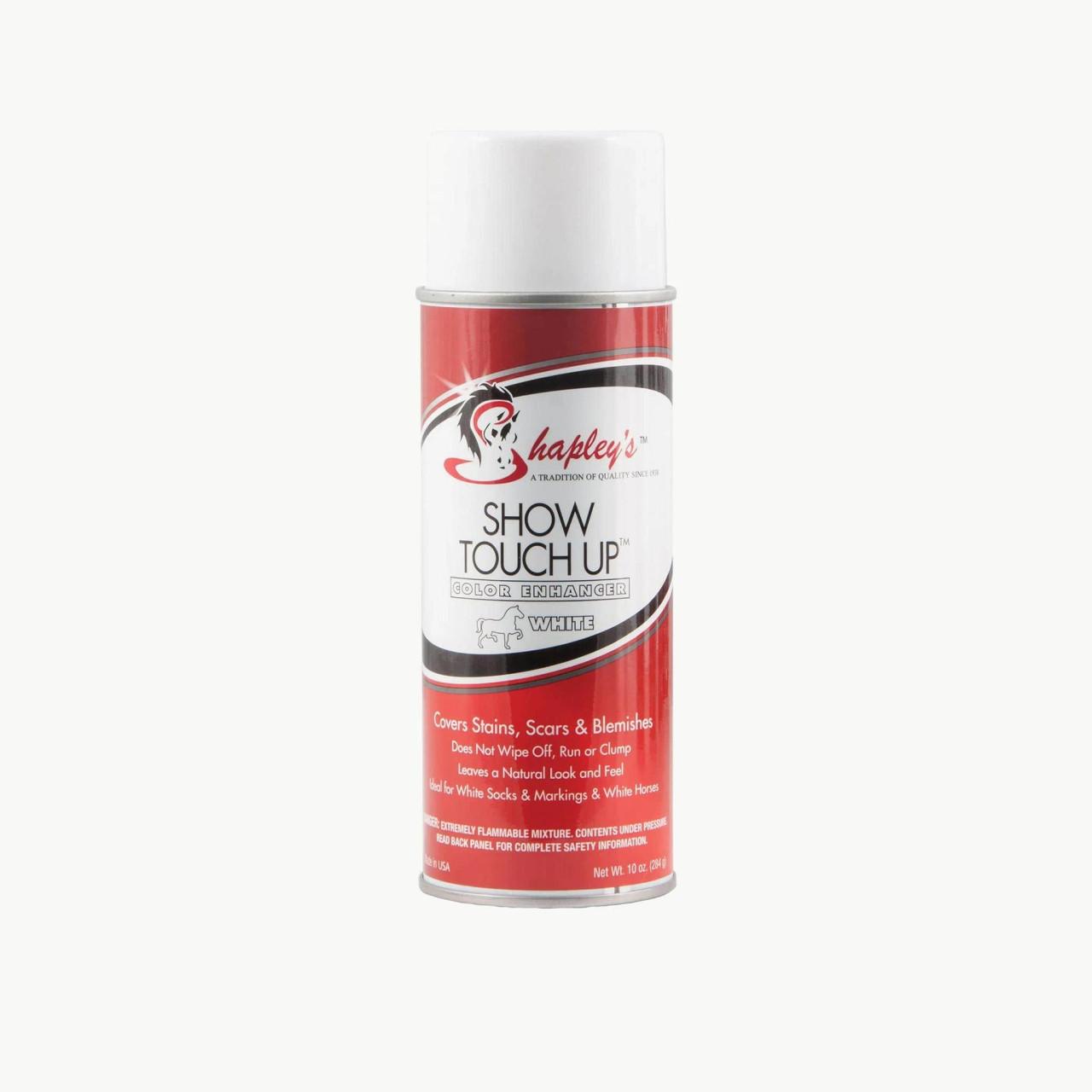Show touch ups were created exclusively by Shapley's specifically for horses. This incredible product covers stains, scars, blemishes and flaws on horses coat. It can also be sprayed in tails to create a fuller appearance. Show Touch Ups are a must have for any horse competing or whenever want to improve the appearance of horse. Show touch ups are safe and effective to use. They will not wash off in the rain, smear, clump or wipe off. They are easily removed by an oil based product such as Shapley's hi gloss. Do not use an oil based fly spray over the color as it will remove and cause color to run. Show Touch Ups can also wear off horses hair causing no damage. Show Touch Ups produce a natural look and feel. They are excellent to hide any stains or blemishes on horses in halter, conformation or performance classes at shows. The white touch up is incredible for making white markings on horse pop and for covering any stains. Simply spray the show touch up on to horse's coat or tail in an even layer. Add color layer by layer until it matches the surrounding hair or completely covers the stain. Keep can about 12 in from horse as are spraying. Use a cloth to apply to horse's head and in the case of white markings cover the surrounding darker hair with towel, tape or the like to keep white spray from getting on dark hair.
